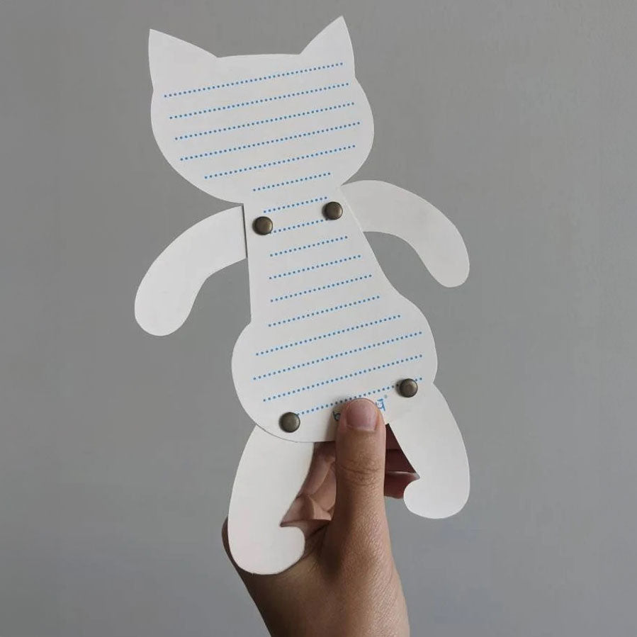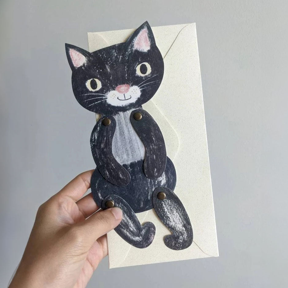 כרטיס נוסטלגי בדמות חתול עם צירים המאפשרים הזזה של הידיים והרגליים, בדיוק כמו הצעצועים של פעם.