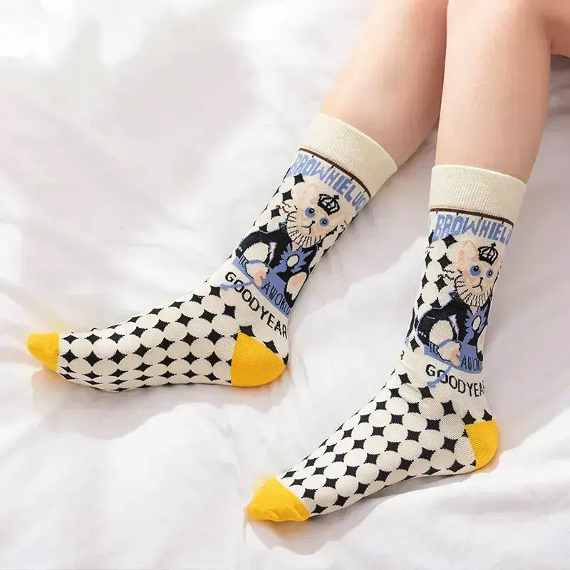 גרביים רכות ונעימות, עם פטרן מעויינים מלכותי ודמות של חתולה ששולטת ביד רמה.
