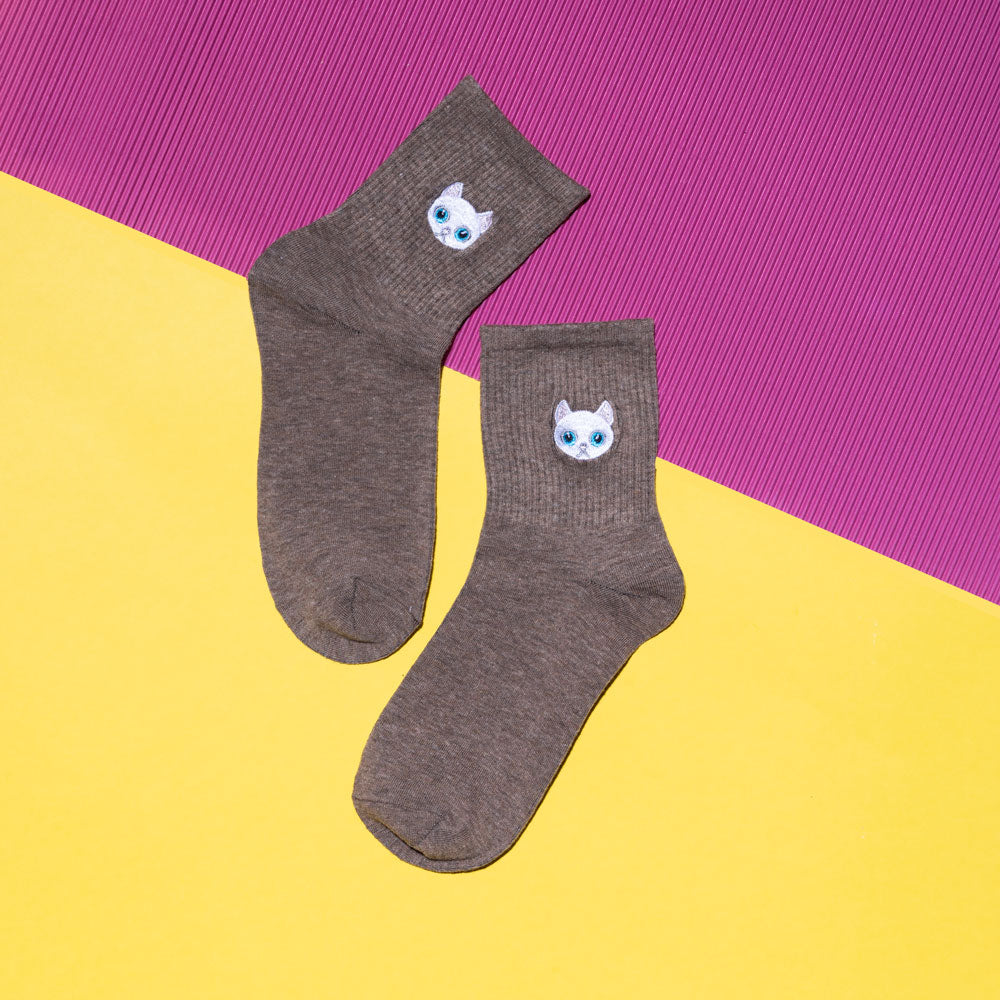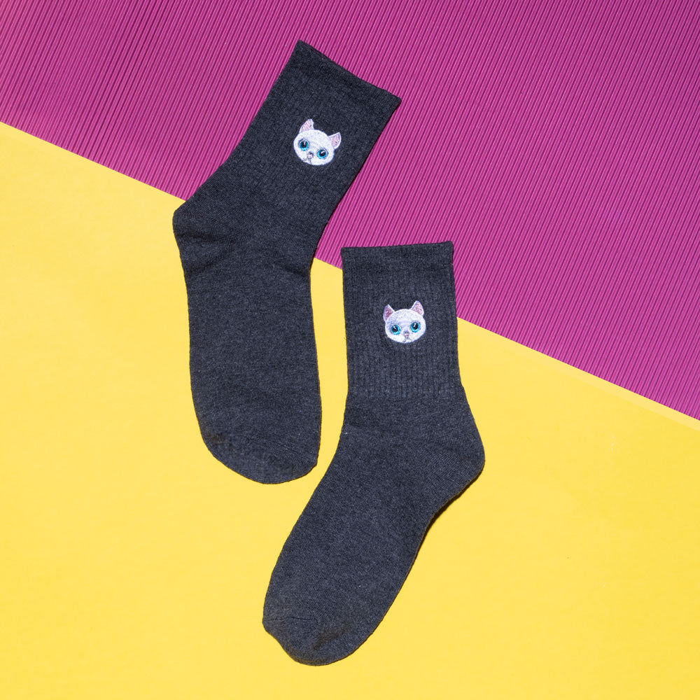 גרביים עם טוויסט חתולי מקסים ואלגנטי שבחלקן העליון רקומים פני חתול חמוד ולבן עם עיניים כחולות. מגיעות בשני צבעים לבחירתכם.