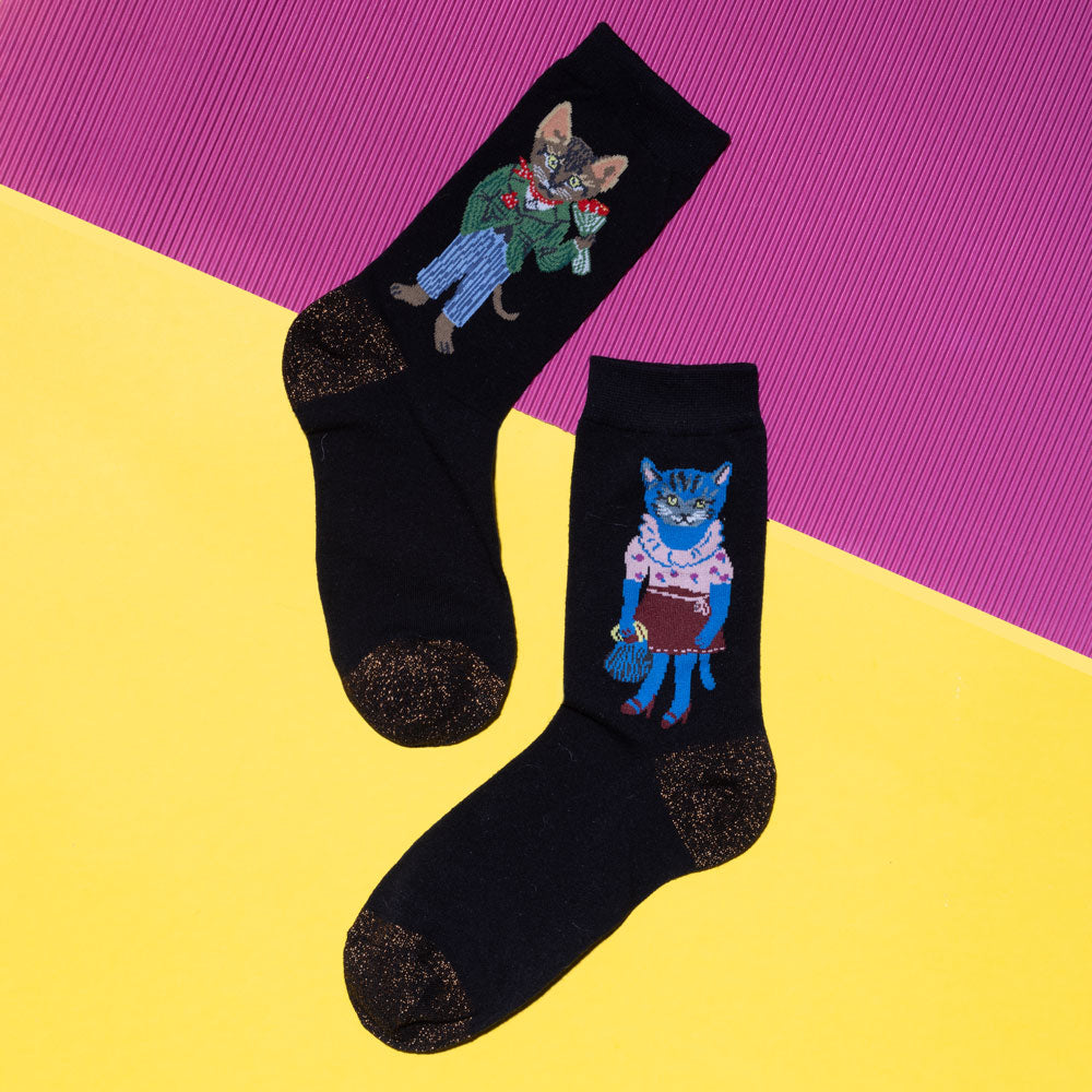 גרביים שחורות מעוטרות כל אחת בדמות חתולית קסומה אחרת בסגנון וינטג' נוסטלגי. הכל עטוף בנצנוץ מוזהב קסום בקצוות.