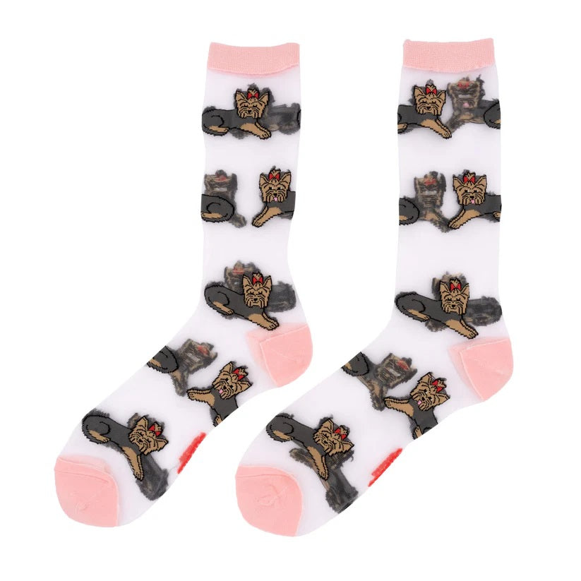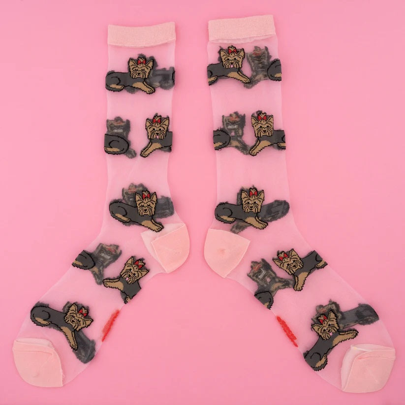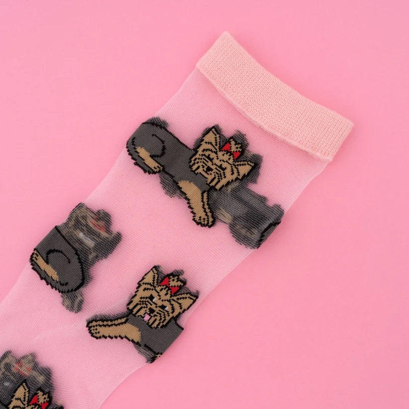 גרביים שקופות ומקסימות עם הדפס של יורקשיירים שובבים וטאצ' של צבע אפרסק. המתנה המושלמת לחובבי כלבים או סתם מי שמעריך סטייל הומוריסטי ומיוחד.