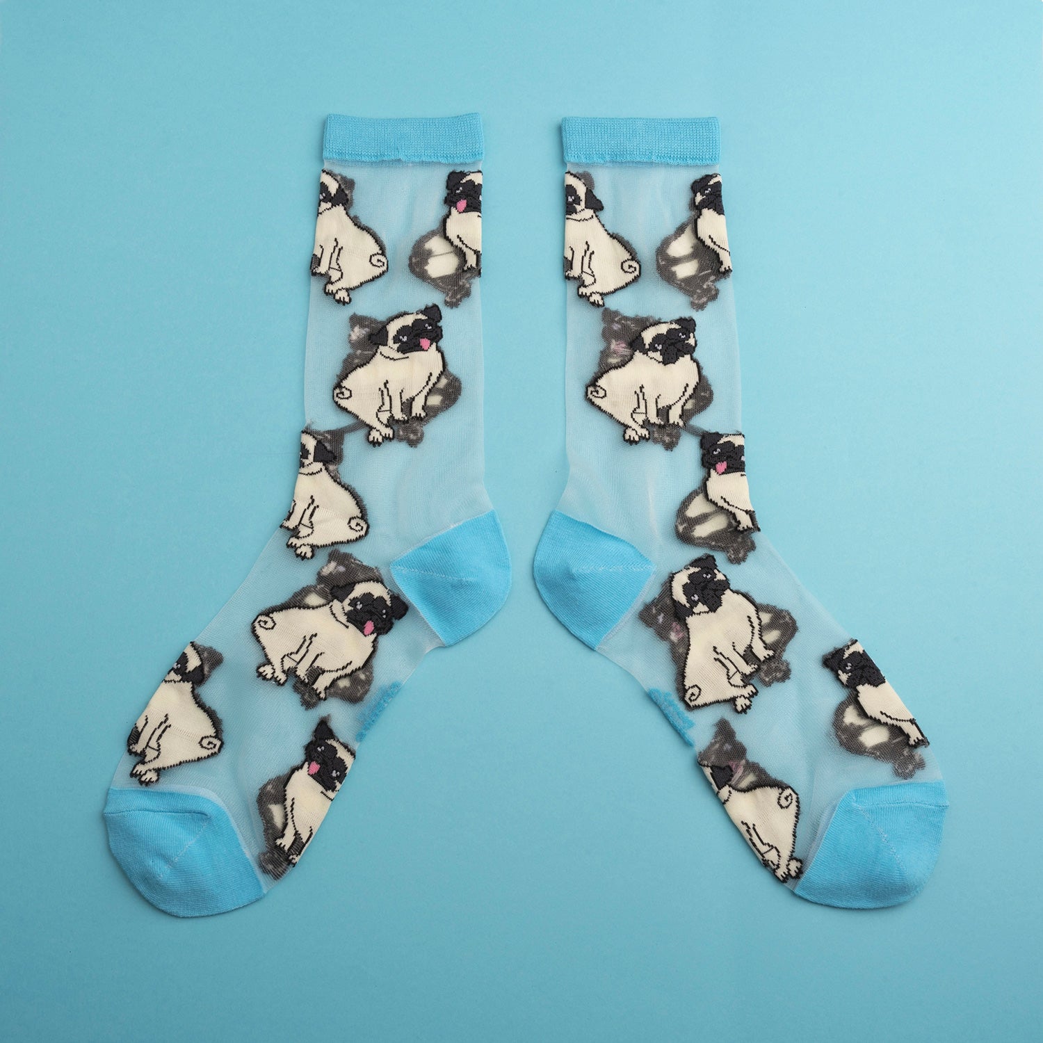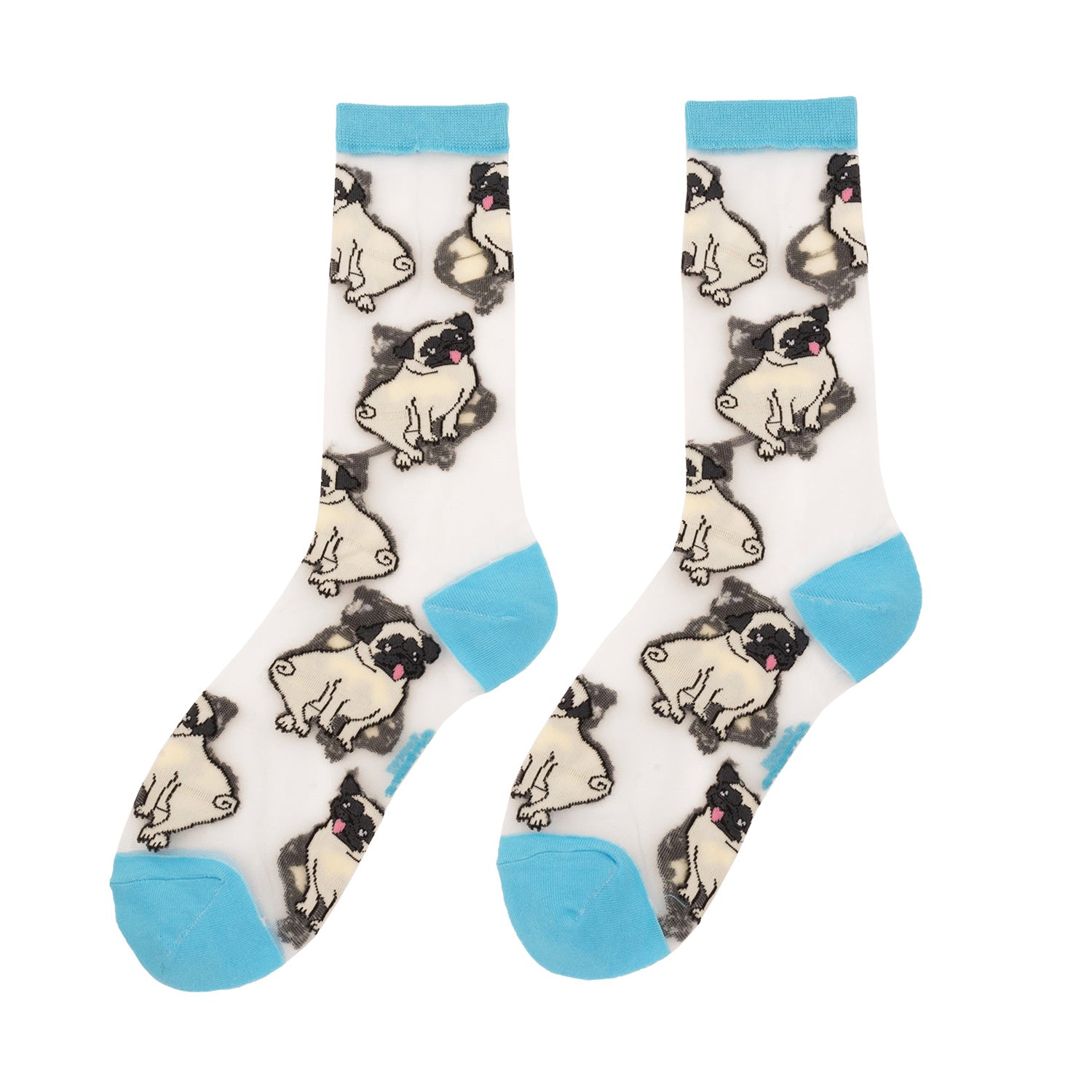 גרביים שקופות מהמותג המיוחד והאיכותי COUCOU SUZETTE עם פאג סיני מתוק ונגיעות של צבע תכלת. מושלם לכל מי שאוהבת כלבים ובייחוד פאגים.