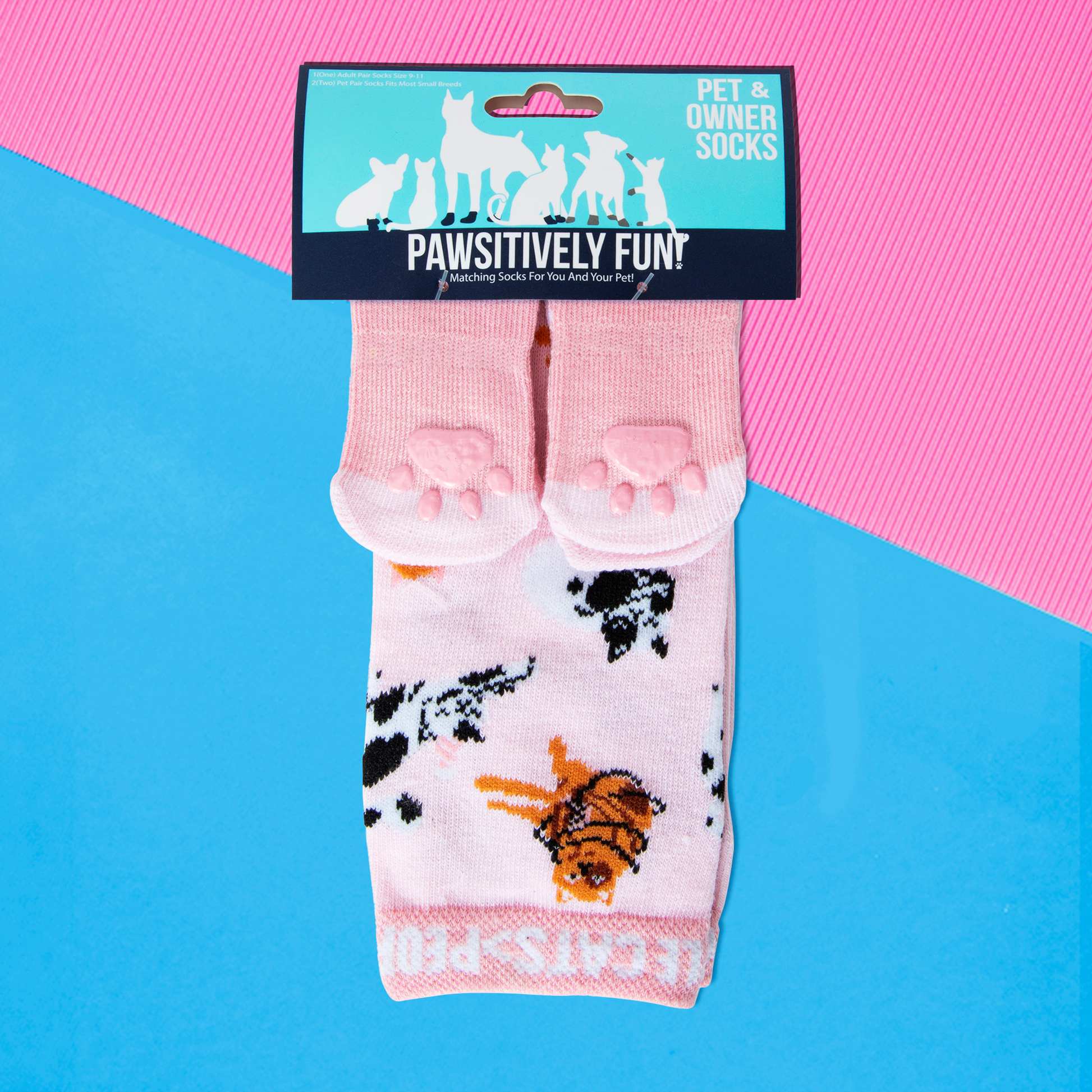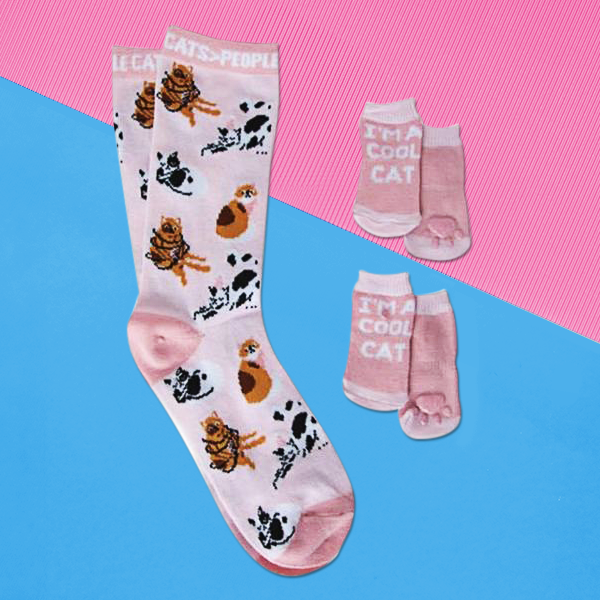 סט גרביים שיגרום לכם ולחתול שלכם להיראות מדהים ביחד! הגרביים של הבעלים בצבע ורוד מעוטרות בהדפסים שובי לב של חתולים בצבעם שונים, עם המסר המשעשע Cats over people, בעוד שהגרביים של החתול עם הכיתוב המגניב I'm a cool cat וכריות מיוחדות נגד החלקה. פריט שכיף ללבוש וכיף עוד יותר להראות לאחרים.
