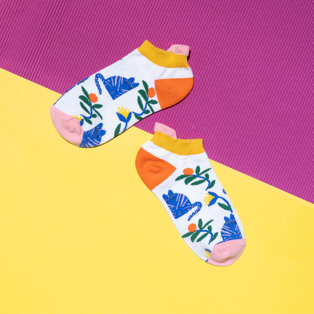 גרבי סניקרס נמוכות, בצבעי פסטל מרעננים עם פרינט מיוחד של חתול ופרחים.