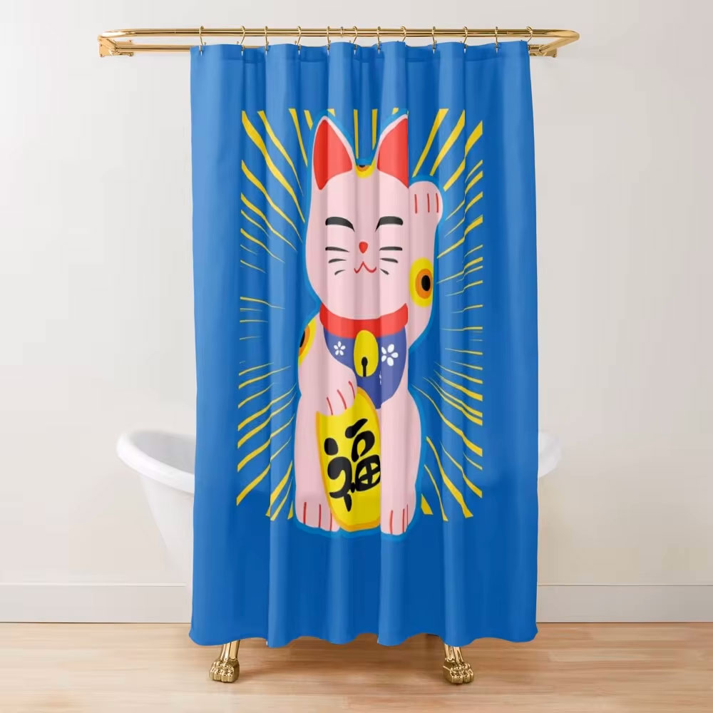 וילון אמבטיה עם חתול המזל היפני במלוא הדרו - לאקי קאט גדול וקסום על רקע כחול נועז. תוספת צבעונית ומרהיבה שמביאה איתה בוסט של אנרגיה חיובית וסטייל לחלל האמבט שלכם.