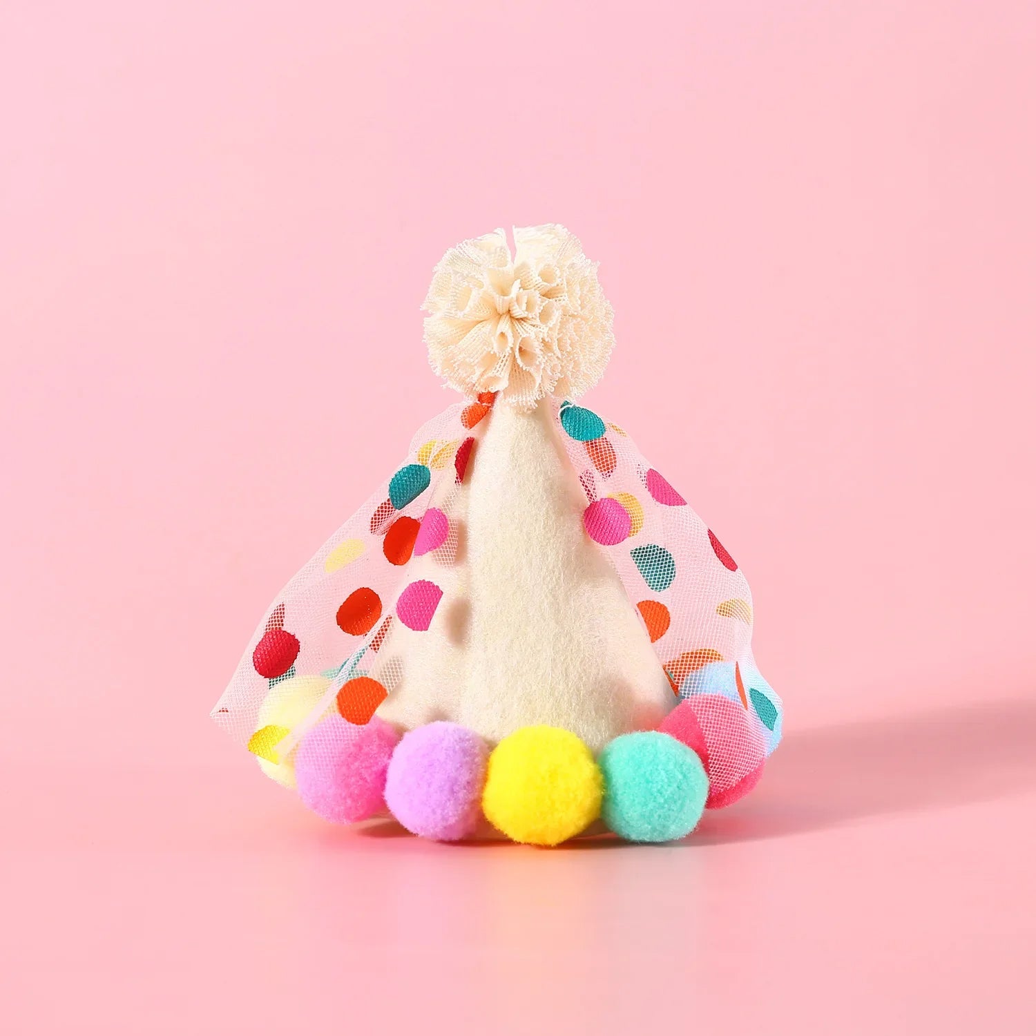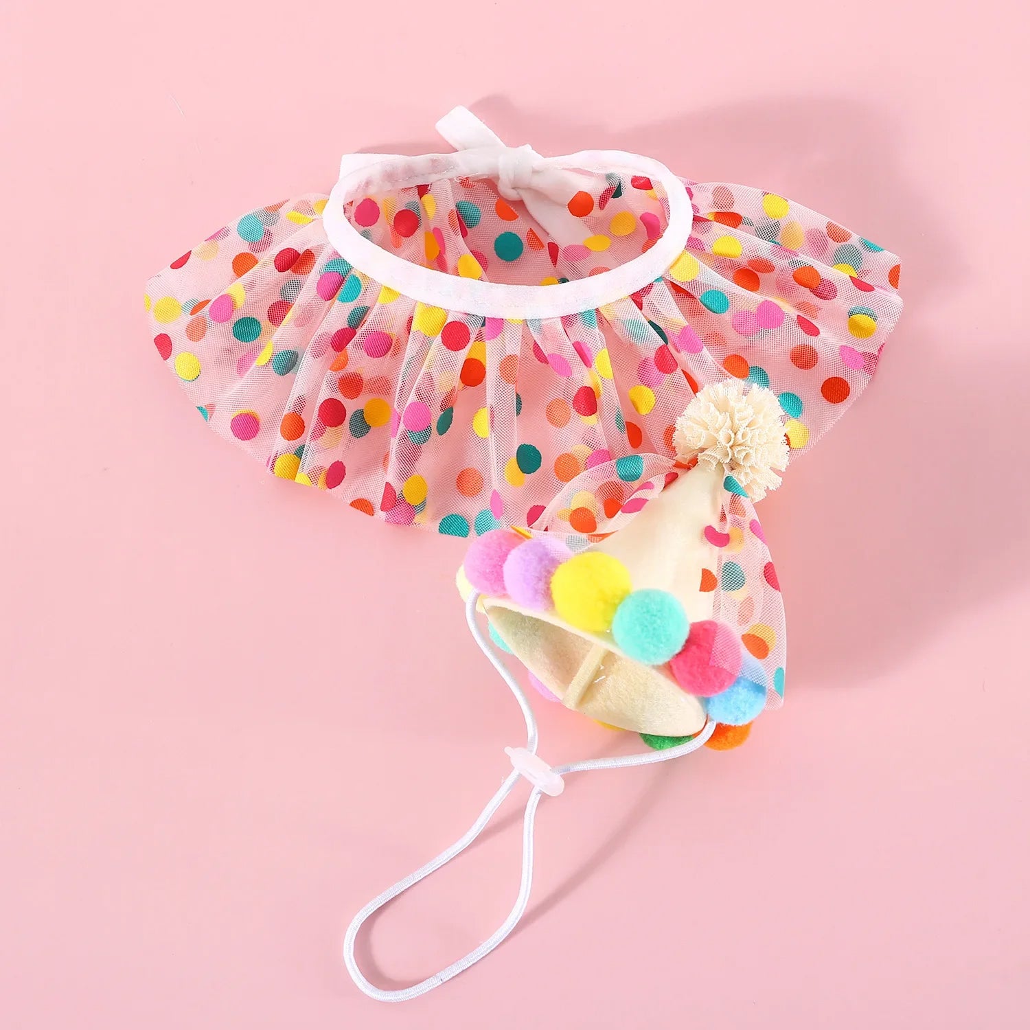הכובע עשוי לבד איכותי, עם פונפונים רכים, בד טול לבן והדפס נקודות צבעוניות. הצווארון? תואם כמובן – כי סטייל זה חלק מהעניין.