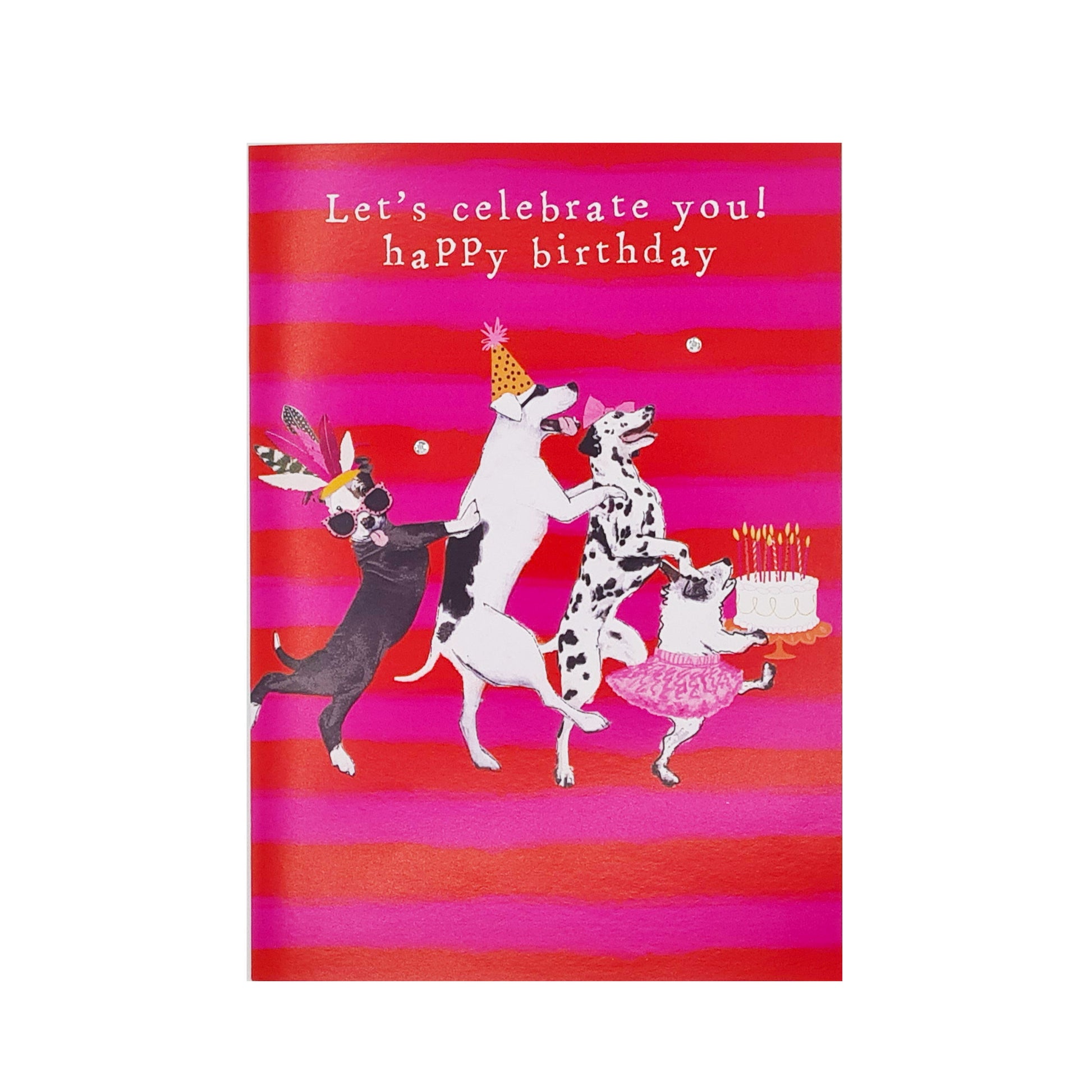 ברכה ליום הולדת עם איורים של כלבים שובבים חובשים כובעי יום-הולדת מצחיקים ואפילו חצאית. מגיע עם מעטפה תואמת.