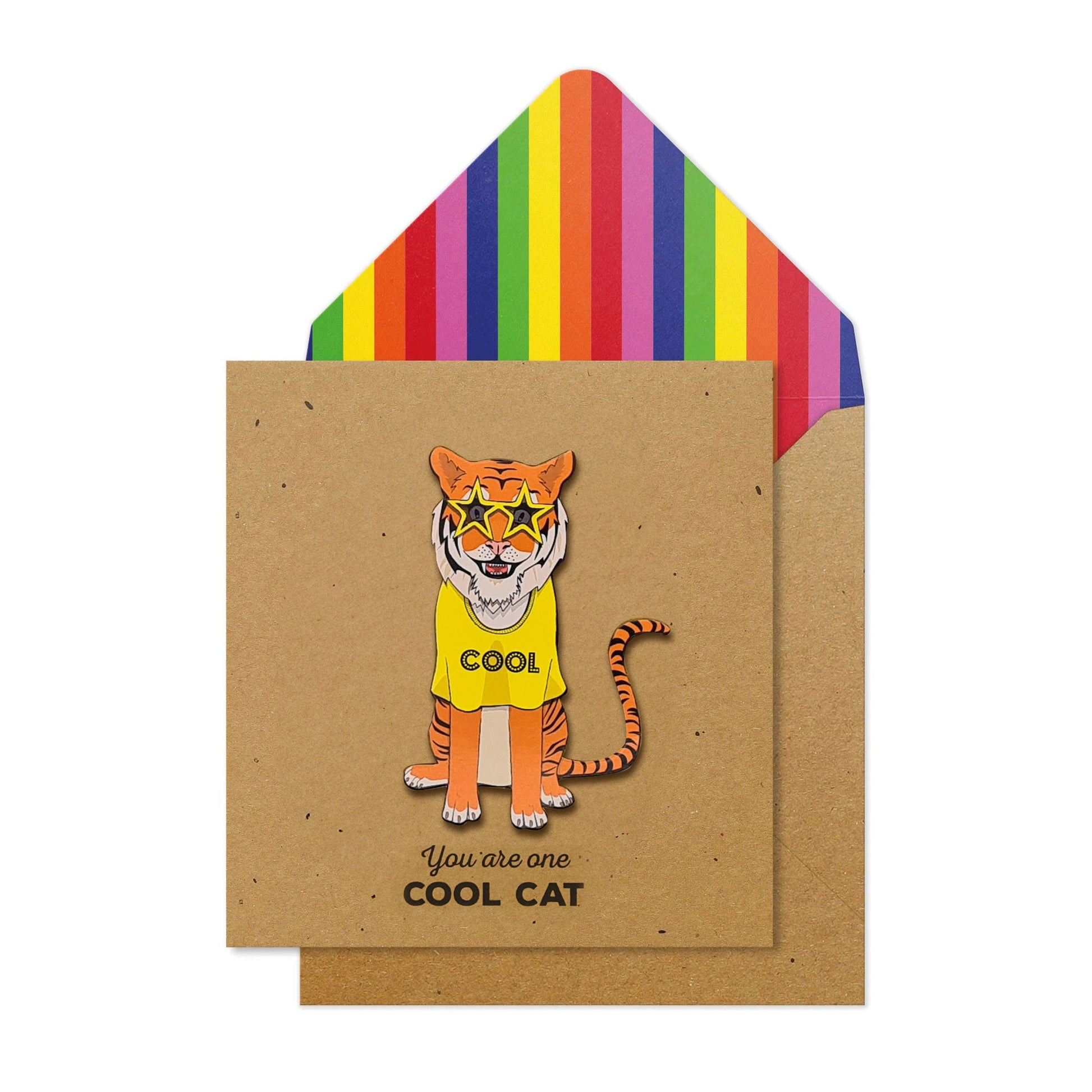 כרטיס ברכה צבעוני, עשוי נייר ממוחזר ואיכותי, עליו דמות נמר מובלטת. מגיע עם מעטפה תואמת, יפיפיה וצבעונית.