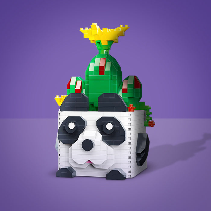משחק הרכבה של עציץ קקטוס פרחוני משולב עם דוב פנדה. מתנה מקורית לחובבי ז'אנר משחקי ההרכבה, אוהבי החיות והורגי הצמחים.