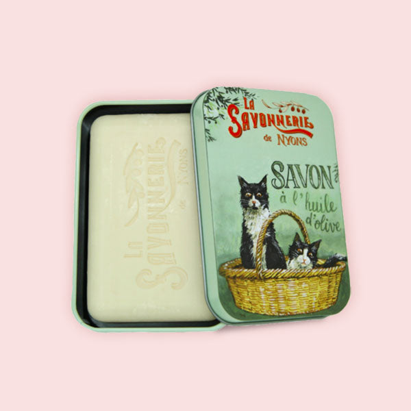 קופסת פח בסגנון וינטג' עם איור נוסטלגי של חתולים בסלסלה. הקופסה מכילה סבון של החברה הצרפתית "לה סבונרי". סבון בריח כותנה נעימה, עשוי בעבודת יד מחמאת שיאה ושמן זית.