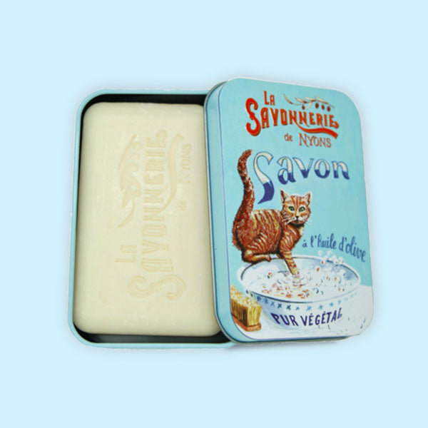 קופסת פח בסגנון וינטג' עם איור נוסטלגי של חתול ואמבטיית קצף. הקופסה מכילה סבון של החברה הצרפתית "לה סבונרי".