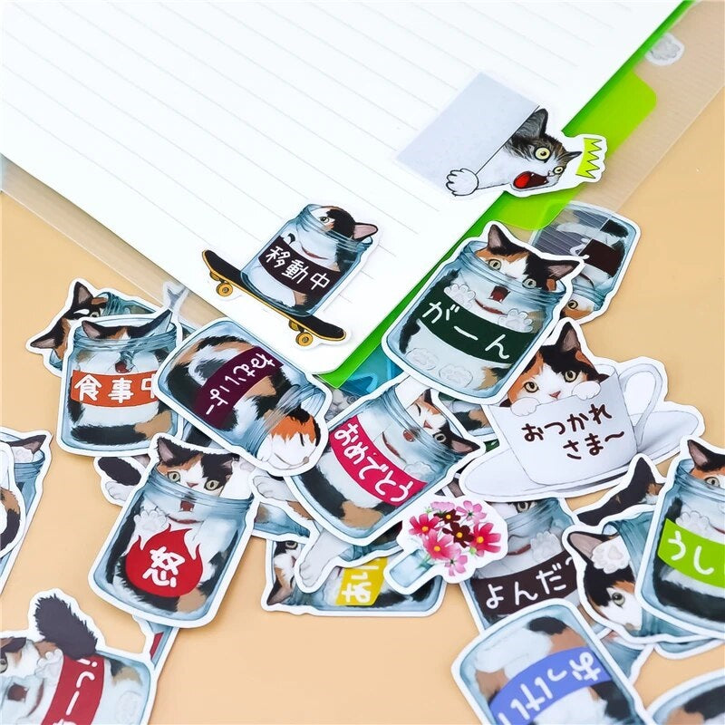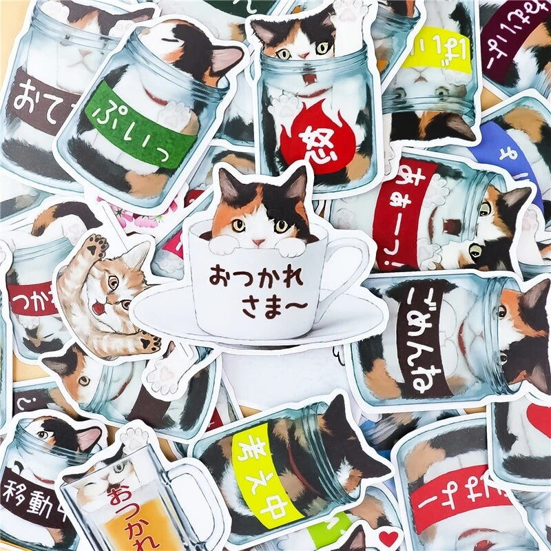 מדבקות בסגנון יפני, מצחיקות ומתוקות של חתולים בתוך צנצנות.