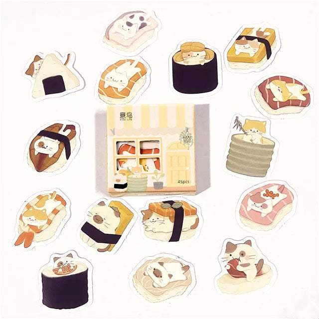 45 מיני מדבקות משעשעות של חתולים מגולגלים בסושי מאויירים בסגנון של צבעי מים. מתנה מושלמת לאוהבי חתולים וסושי.