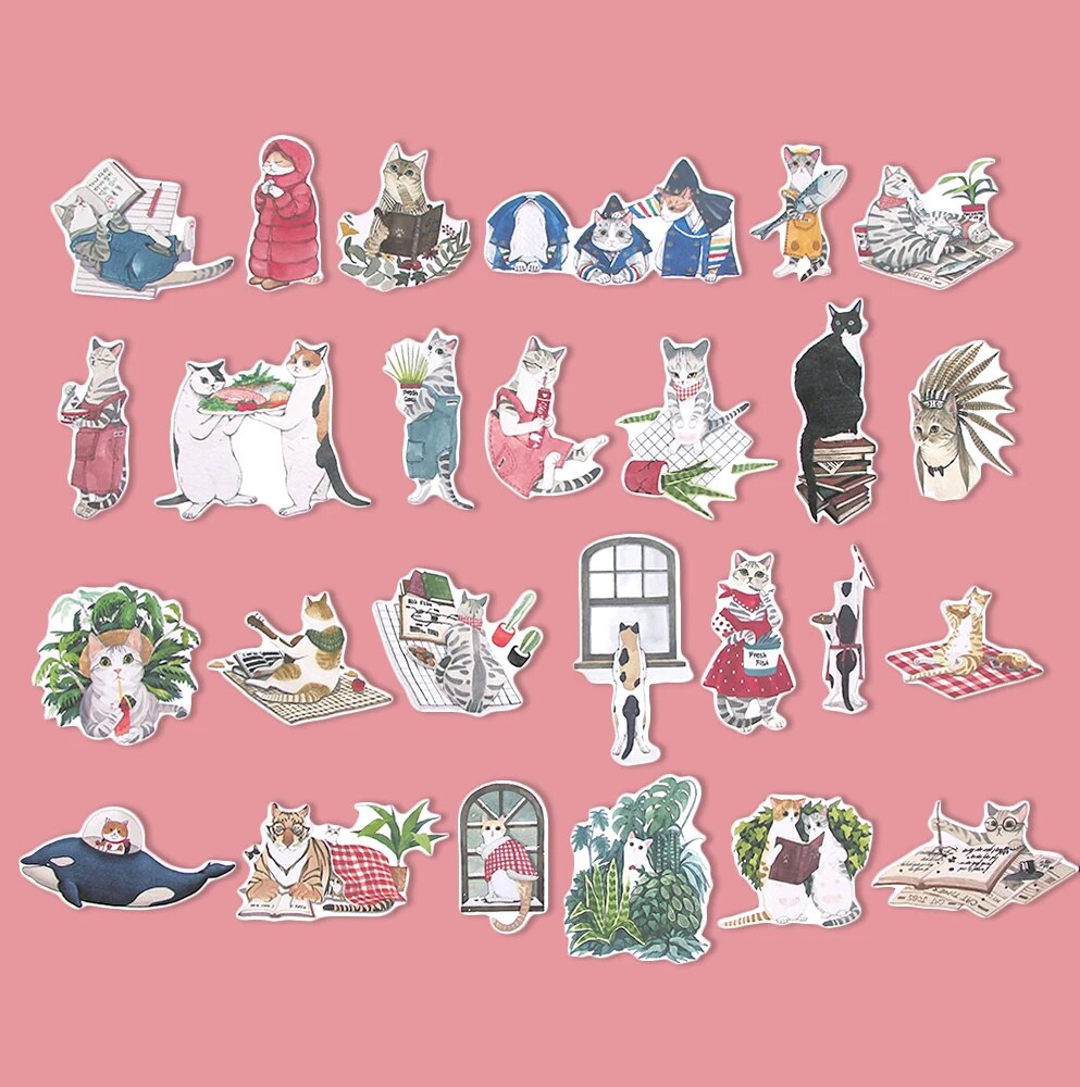 26 מדבקות בסגנון יפני, של חתולים במגוון מצבים משעשעים.