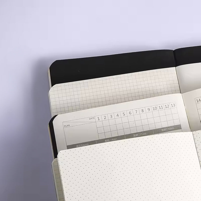 בתוך המחברת תמצאו מגוון סוגי דפים: דפי נקודות לשרטוט, דפי משבצות לארגון, דפים שחורים ליצירה ודפי תכנון לוח זמנים.