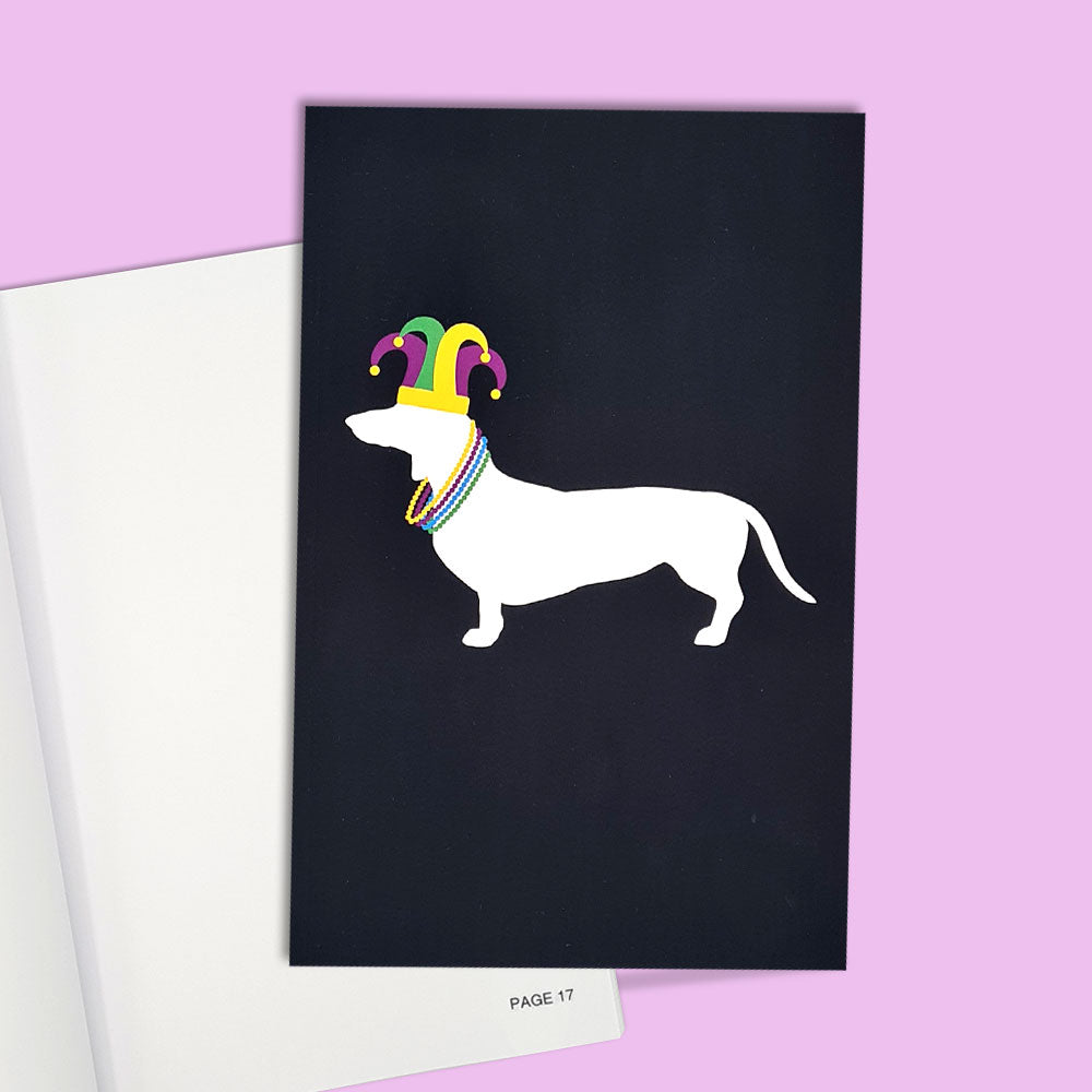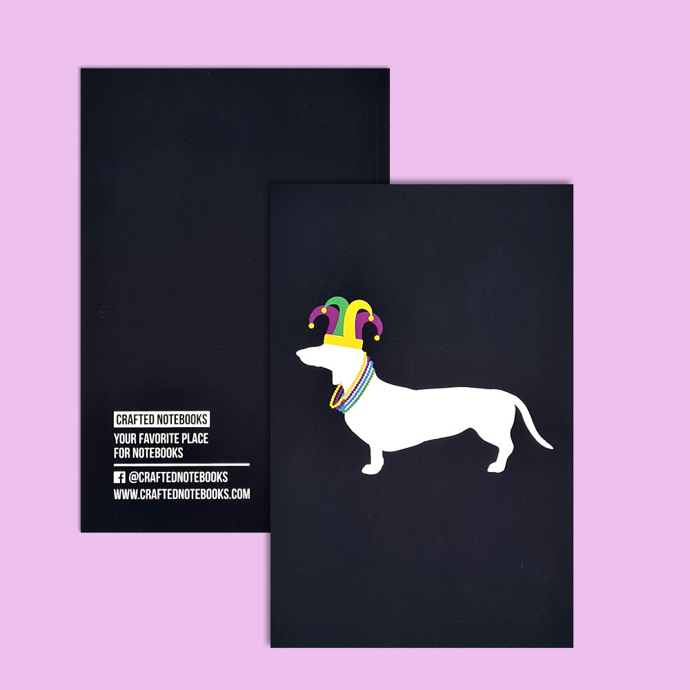 מחברת גדולה ואלגנטית, מעוטרת באיור של כלב תחש עם כובע ליצן צבעוני ומשעשע.