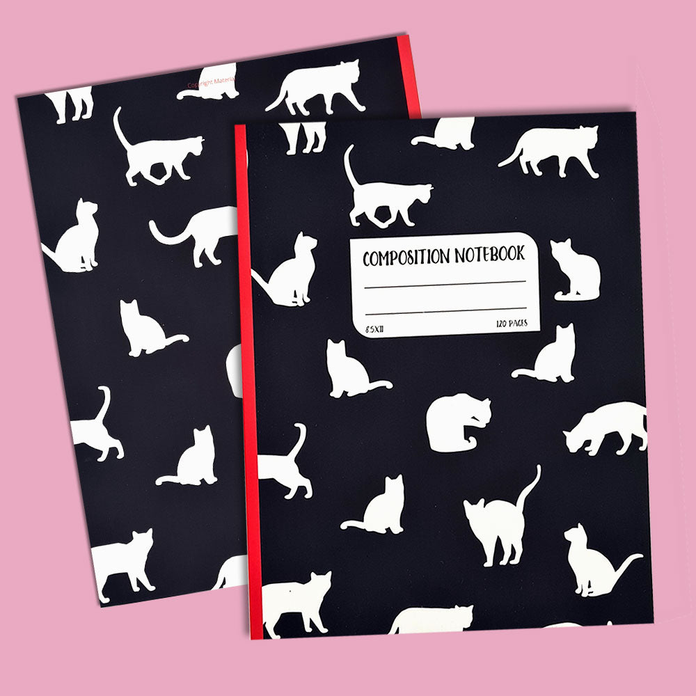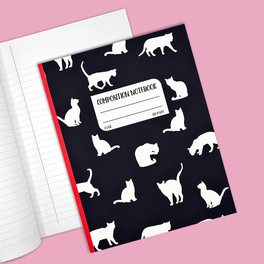מחברת שחורה ומבריקה עם שדרה אדומה שתגרום לכל חובב חתולים להתאהב ברגע הראשון. מעוטרת בפטרן של חתולים לבנים בתנוחות שונות, ועם מקום מיוחד לרשום שם ואת נושא המחברת. מושלמת לכותבים באנגלית שרוצים להוסיף קצת חמידות לשגרת הכתיבה היומיומית.