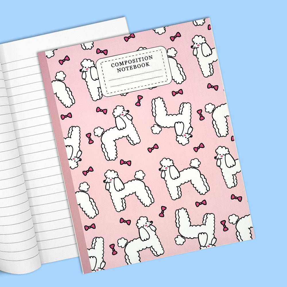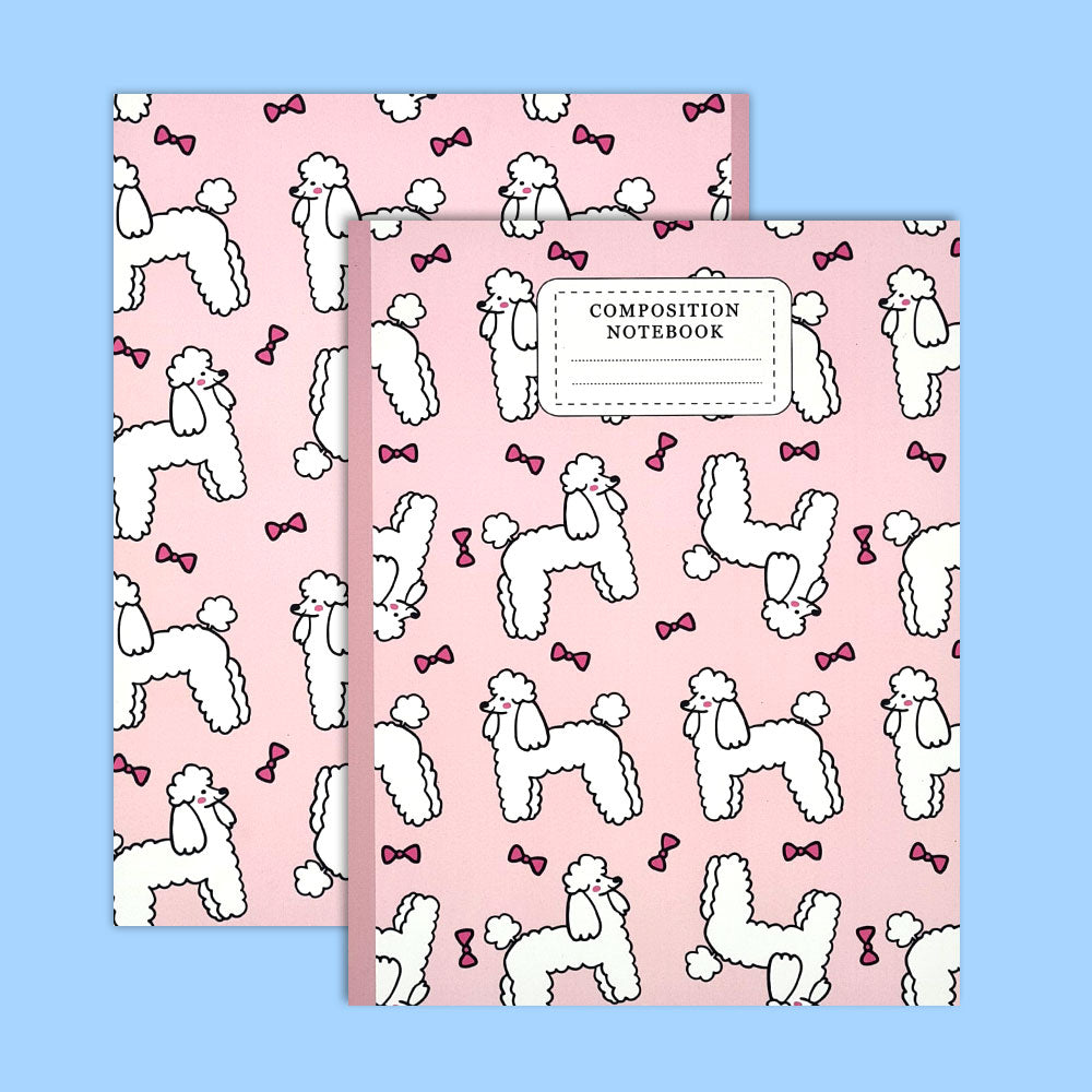 מחברת גדולה עם פטרן מתוק של פודלים לבנים ופפיונים ורודים על רקע ורוד בהיר.