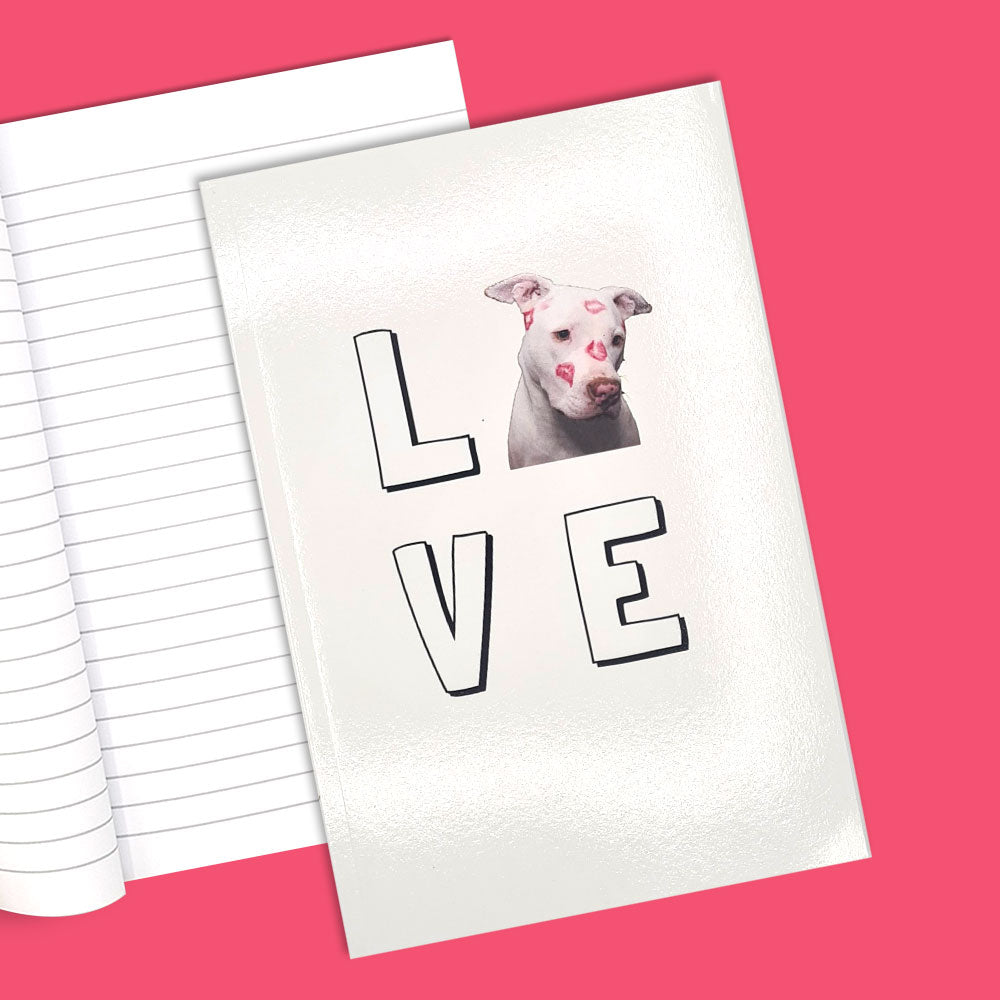 מחברת לבנה בעיצוב מינימליסטי מעוטרת במילה LOVE בשילוב פנים מתוקות של פיטבול שזכה לקבל מלא נשיקות.