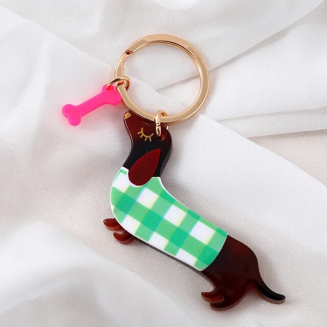 מחזיק מפתחות חמוד בצורת כלב נקניקיה חום שלובש סוודר משובץ ירוק ולבן, משולב עם עצם בצבע ורוד.