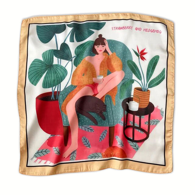 מטפחת צבעונית ומקסימה של נערה שקועה בכורסה עם חתול אהוב וצמחיה ססגונית. תוסיף נגיעה צבעונית וקורנת לכל הופעה, לתלייה על תיק, לקשירה בשיער ואפילו לתלייה בבית כאקססורי משגע.