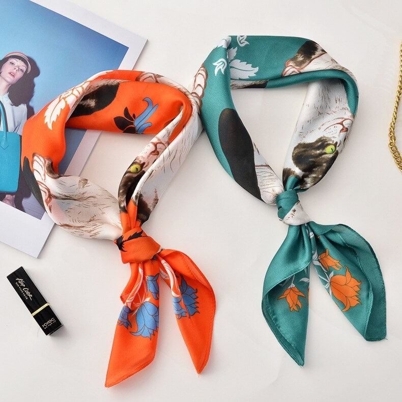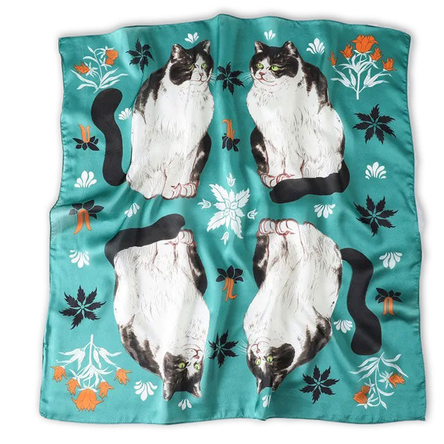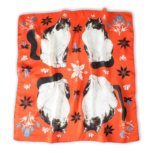 מטפחת צבעונית ומקסימה המציגה ארבע דמויות חתולים על רקעים צבעוניים ועזים עם עיטורי פרחים. מגיעה בשני צבעים מרהיבים לבחירתכם- כתום אדמדם וירוק.