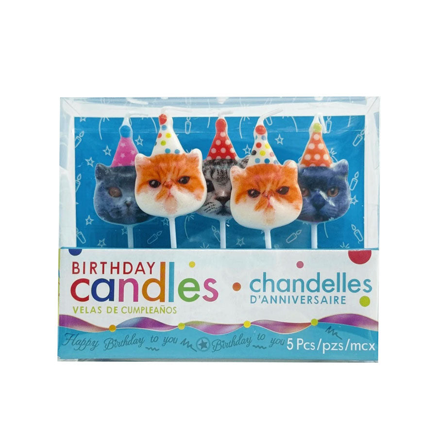 נרות מקסימים לעוגת יום הולדת. בכל חבילה 5 נרות בצורת פרצופי חתול חמודים החובשים כובעי יום הולדת. הנרות מחוברים לקיסמים אותם אפשר לנעוץ.