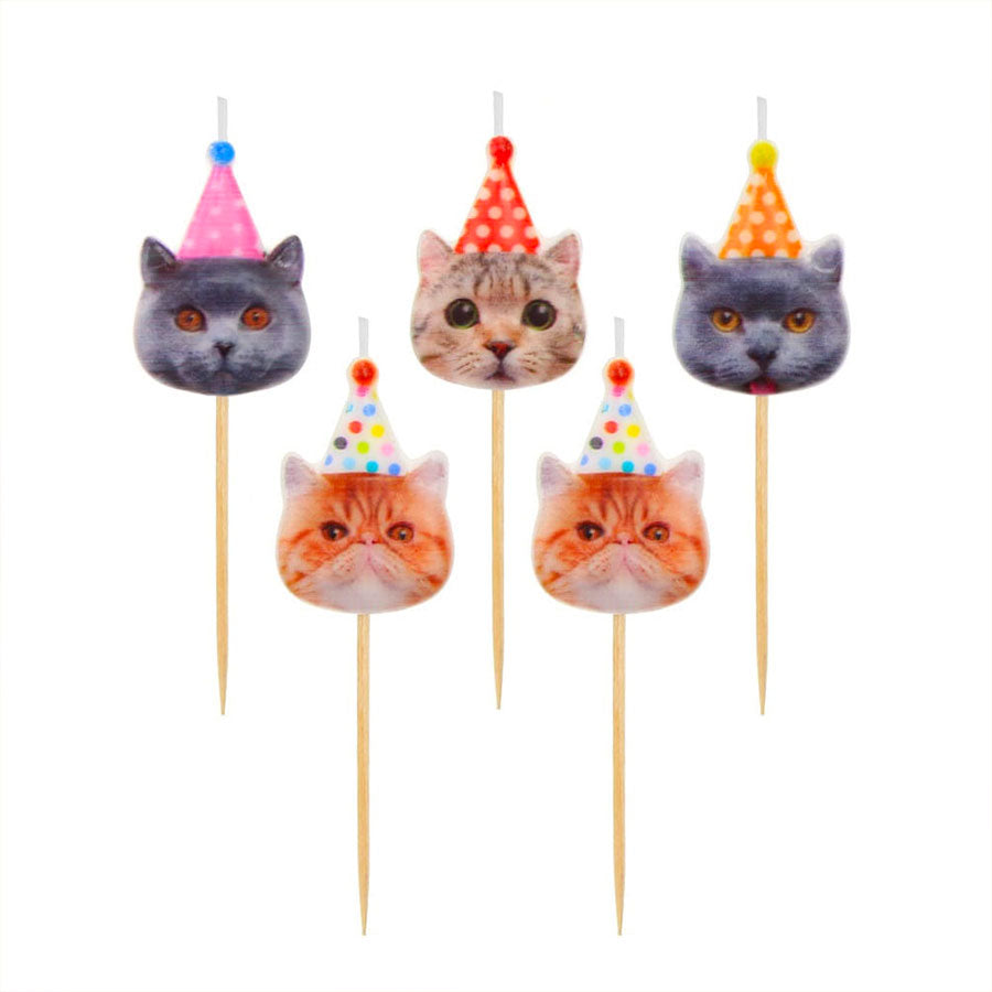 נרות בצורת פרצופי חתול חמודים החובשים כובעי יום הולדת צבעוניים. מיועד לחגיגות יום ההולדת שלכם או של החיה שלכם.