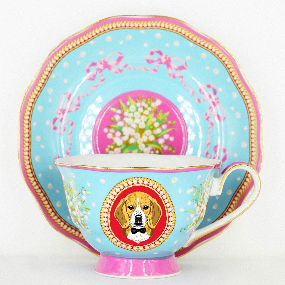 סט מושקע של צלחת וכוס פורצלן עם איור מקסים של ביגל מתוק עם פפיון שחור. העיצוב משלב רקע בגוון כחול, פרחים לבנים וסרטים ורודים - הכל מצויר ביד בצבעים עזים ומעוטר בזהב אמיתי 24K.