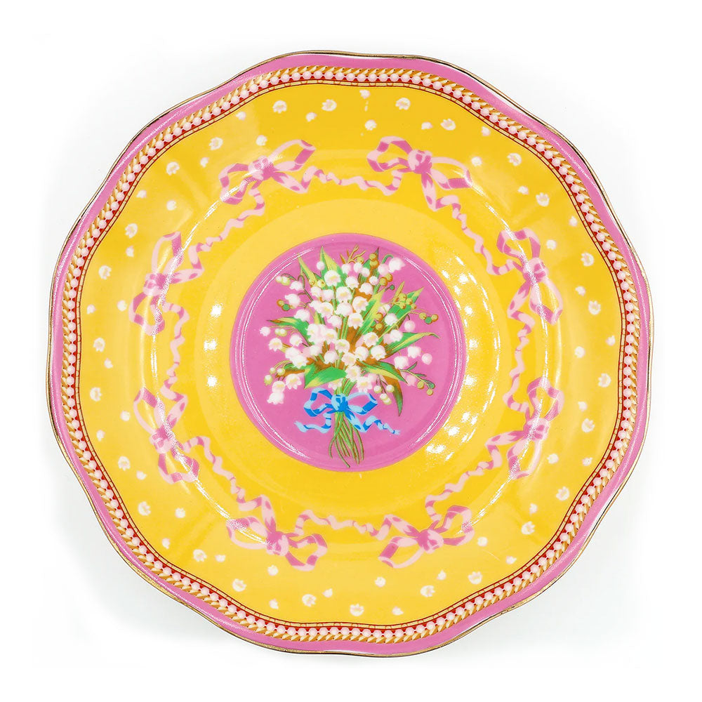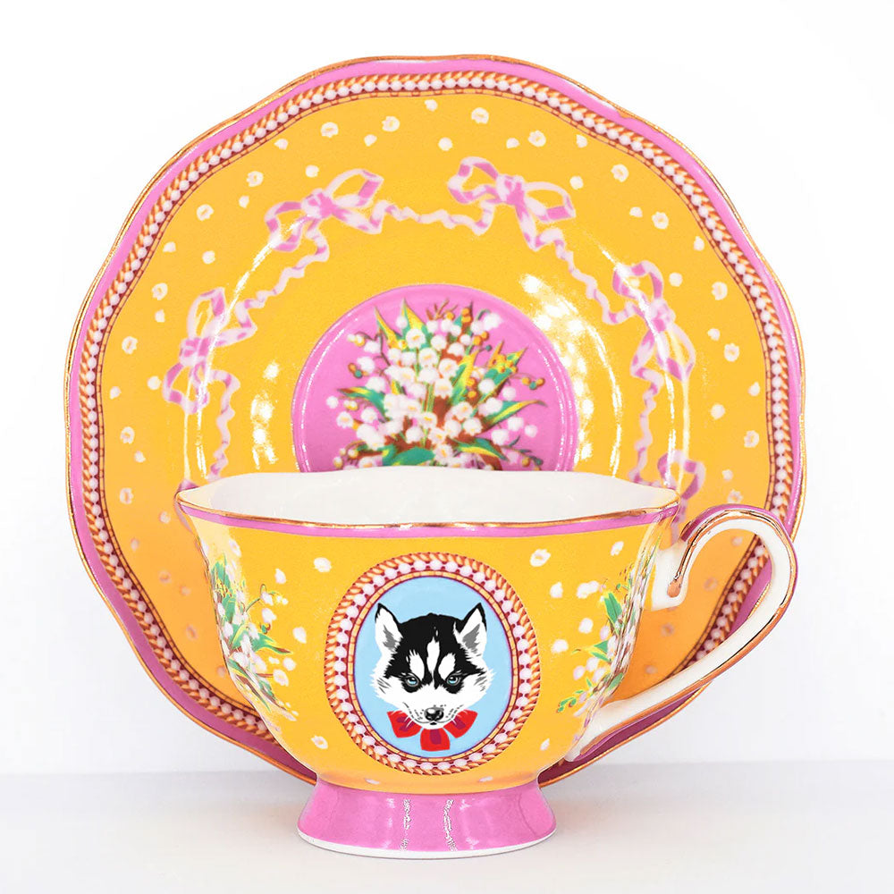 מהדורה מוגבלת! סט מלכותי של כוס וצלחת פורצלן עליהם מופיע איור של האסקי אצילי עם פפיון אדום. העיצוב משלב רקע צהוב שמשי, פרחים לבנים וסרטים ורודים ומעוטר בזהב אמיתי 24K. כל כך יפה שמתאים לא רק לשתיה אלא גם כאקססורי לבית. כל סט מגיע בקופסא מהודרת.