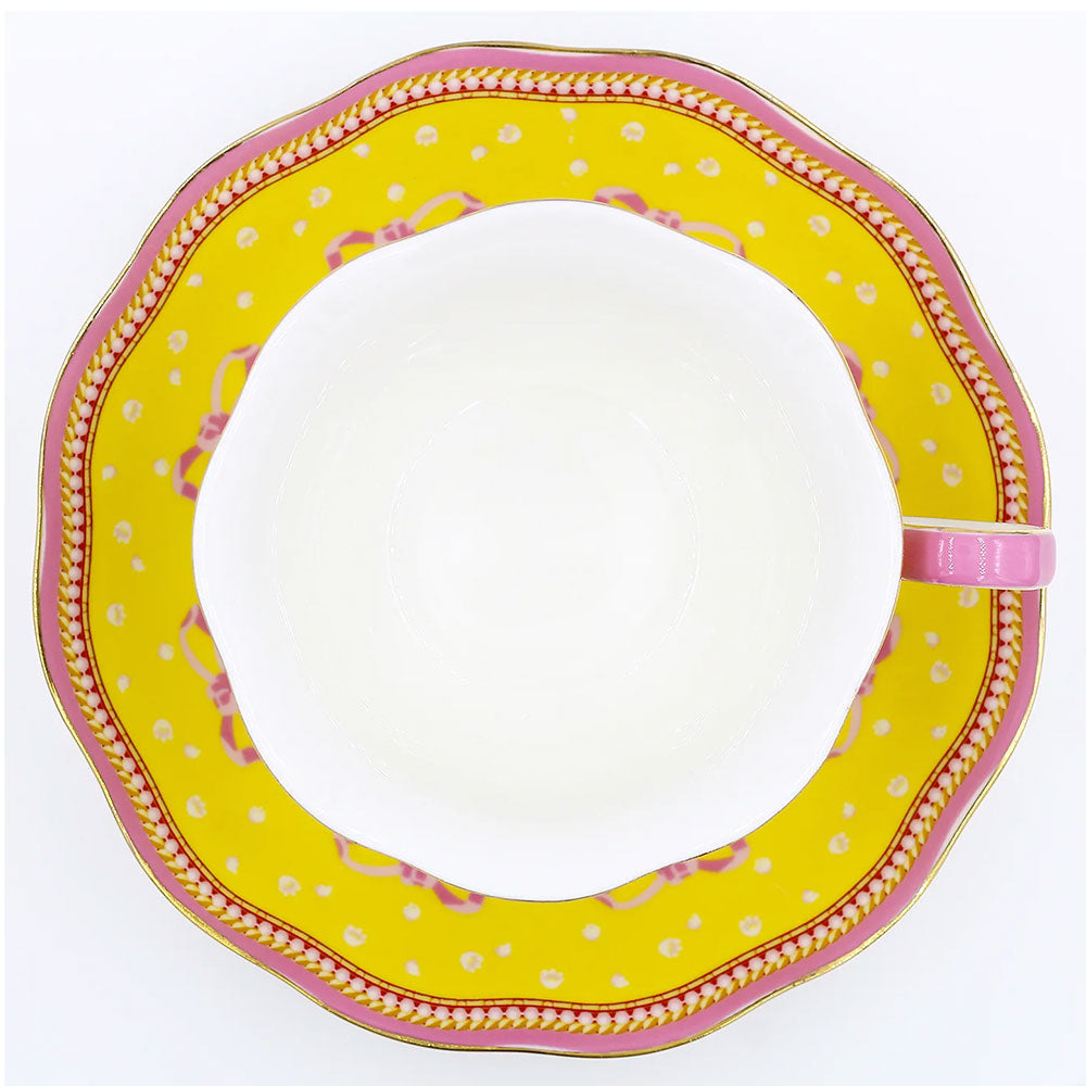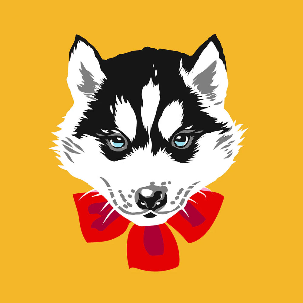 סט מושקע של צלחת וכוס פורצלן עם איור מקסים של האסקי עם פפיון ורוד. העיצוב משלב רקע בגוון צהוב שמשי, פרחים לבנים וסרטים ורודים - הכל מצויר ביד בצבעים עזים ומעוטר בזהב אמיתי 24K.