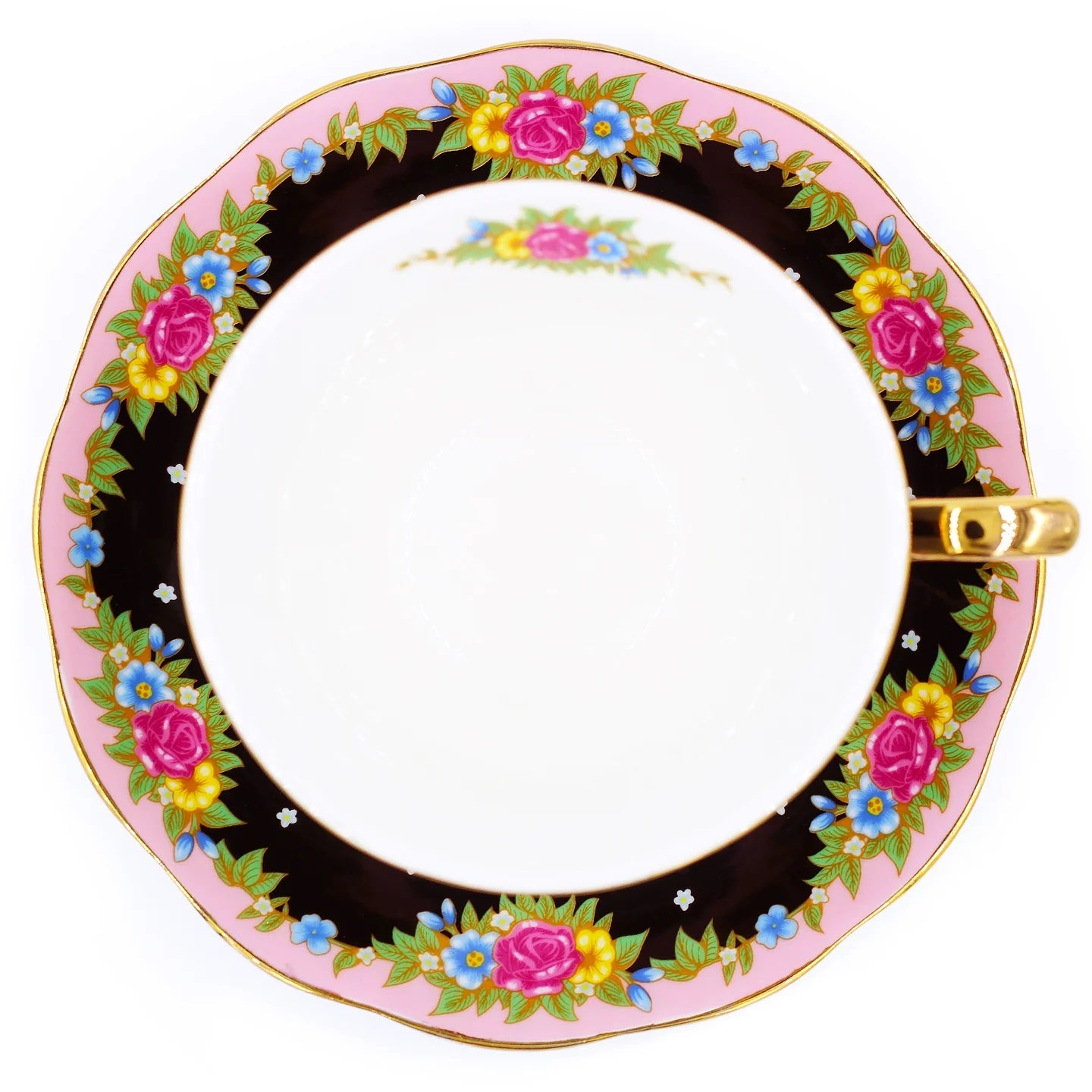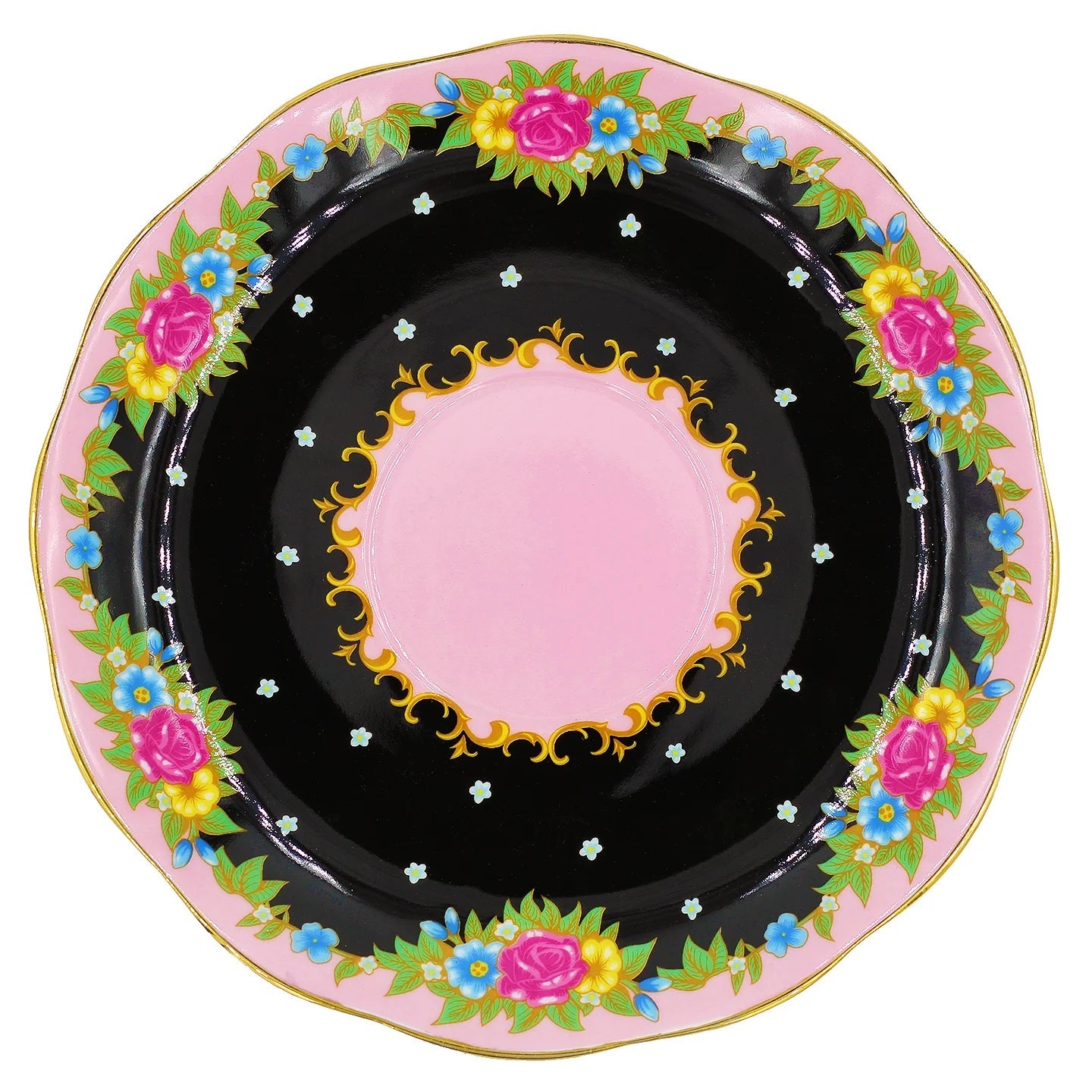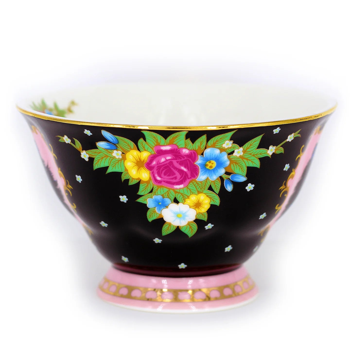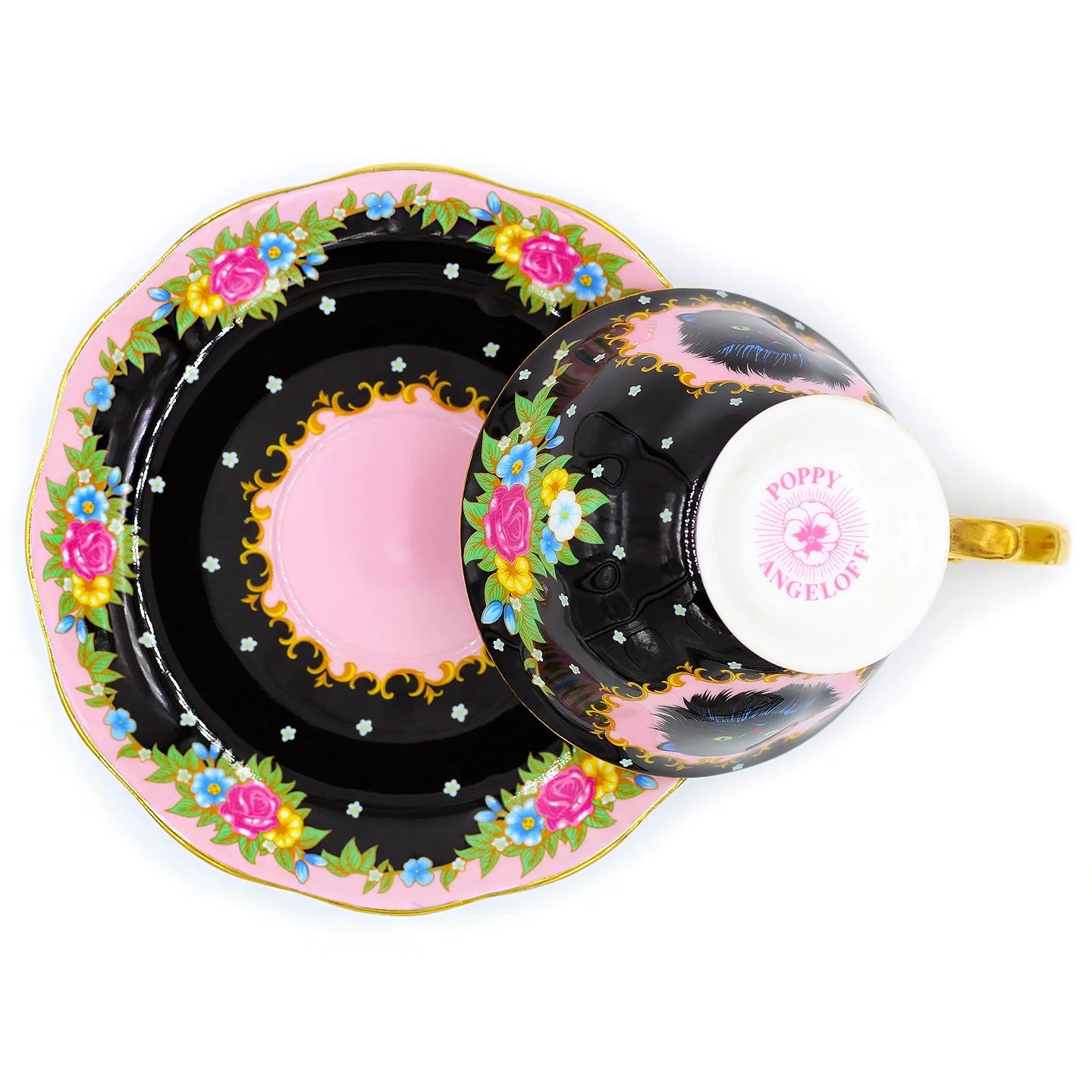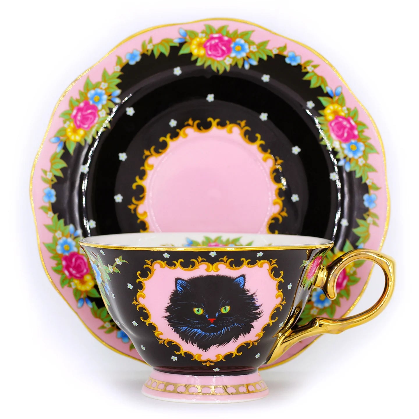 סט מושקע של צלחת וכוס פורצלן עם איור מקסים של חתול שחור אצילי ומלא פרווה. העיצוב משלב רקע בצבע שחור, זרי פרחים צבעוניים ועלים ירוקים - הכל מצויר ביד בצבעים עזים ומעוטר בזהב אמיתי 24K.