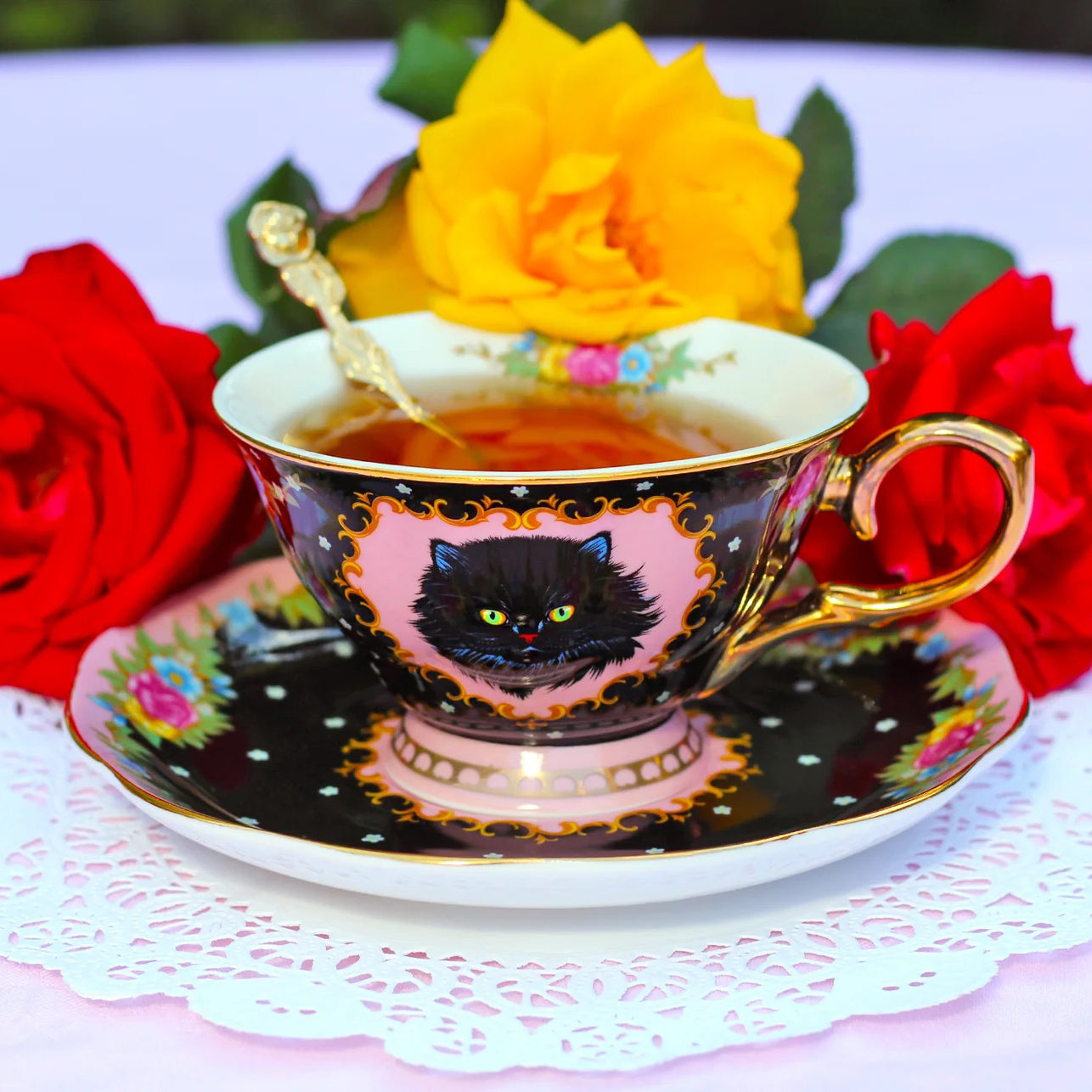 מהדורה מוגבלת! סט מלכותי של כוס וצלחת פורצלן עליהם מופיע חתול שחור אצילי ומלא פרווה. העיצוב משלב רקע בצבע שחור, זרי פרחים צבעוניים ועלים ירוקים, ומעוטר בזהב אמיתי 24K. כל כך יפה שמתאים לא רק לשתיה אלא גם כאקססורי לבית. כל סט מגיע בקופסא מהודרת.