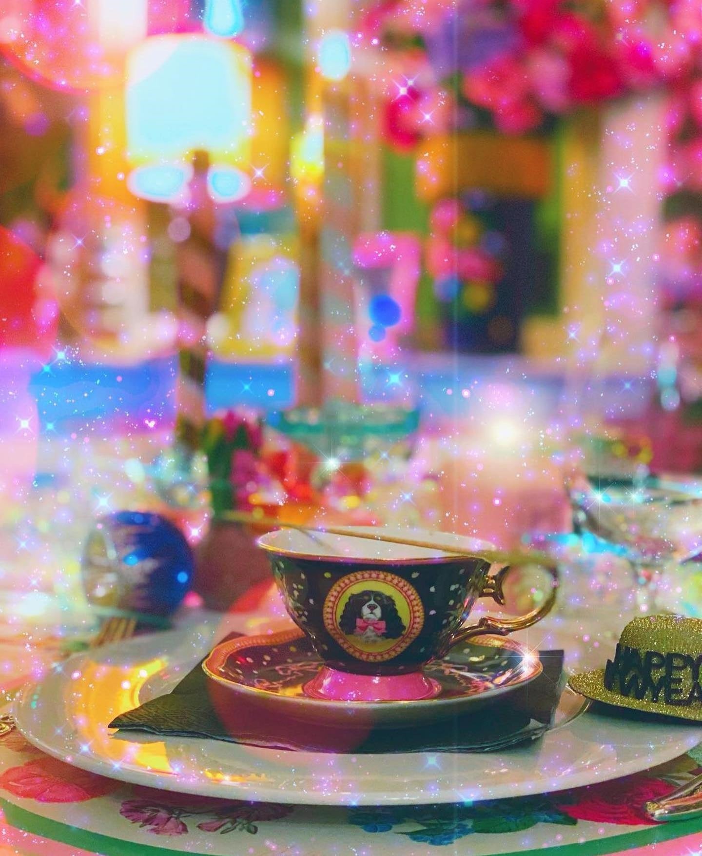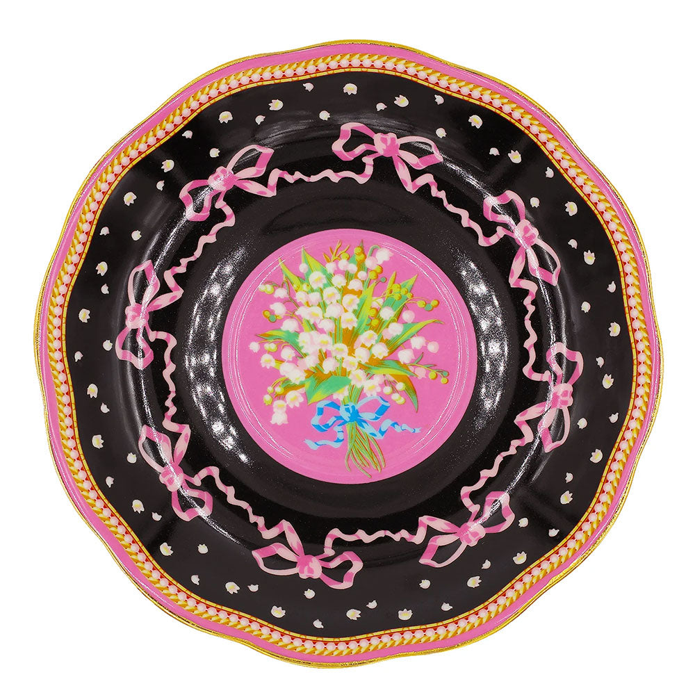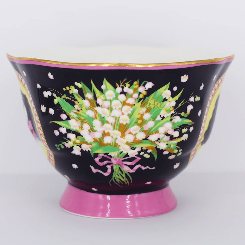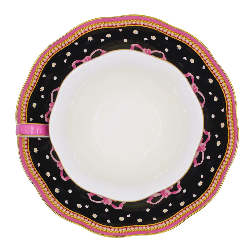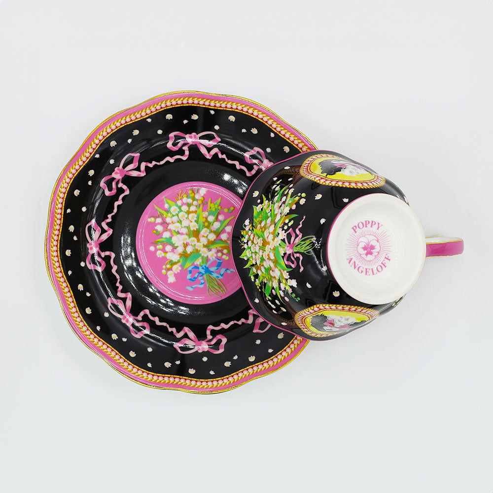 סט מושקע של צלחת וכוס פורצלן עם איור מקסים שלקינג צ'ארלס פרוותי. העיצוב משלב רקע בגוון שחור, פרחים לבנים וסרטים ורודים - הכל מצויר ביד בצבעים עזים ומעוטר בזהב אמיתי 24K.
