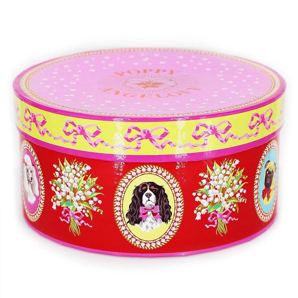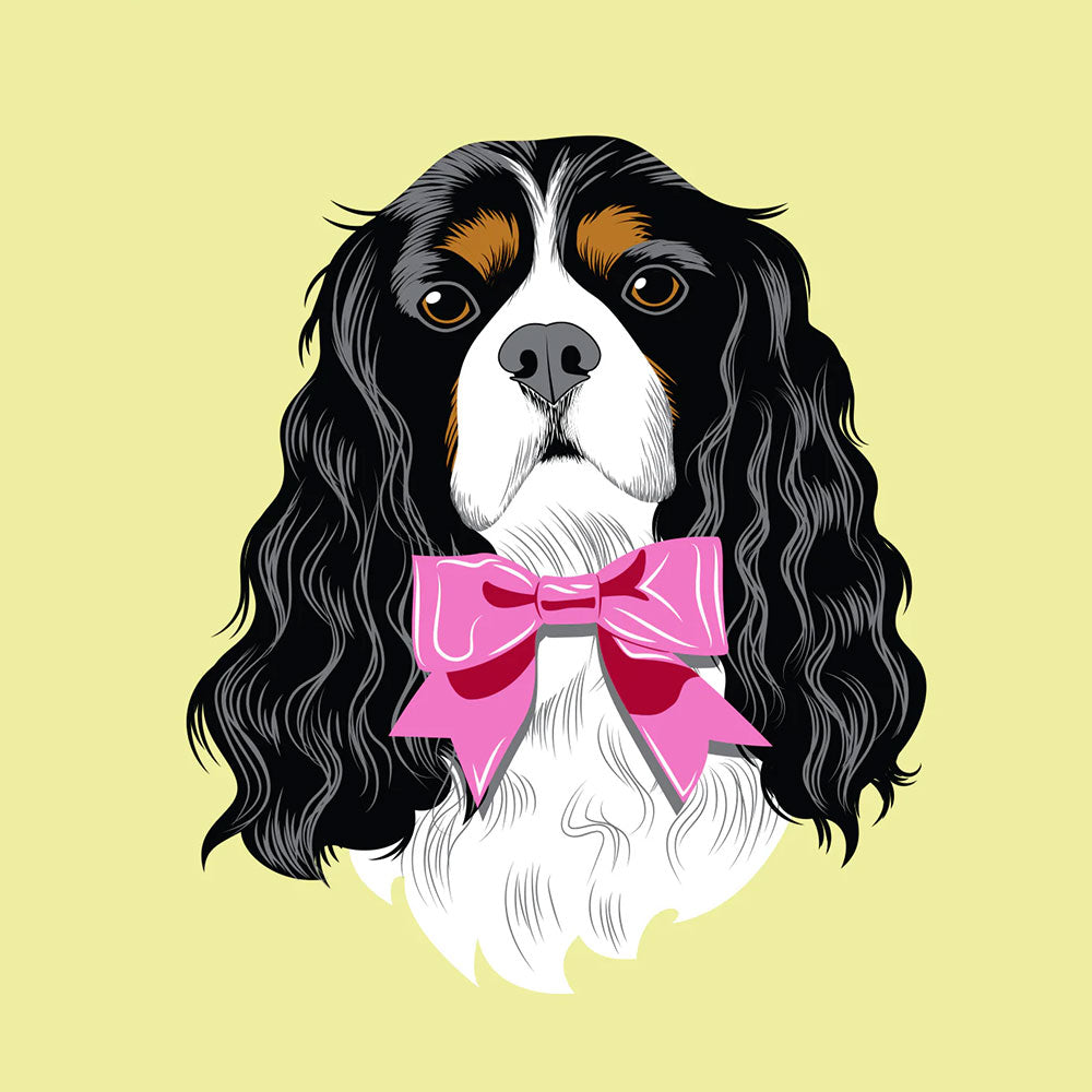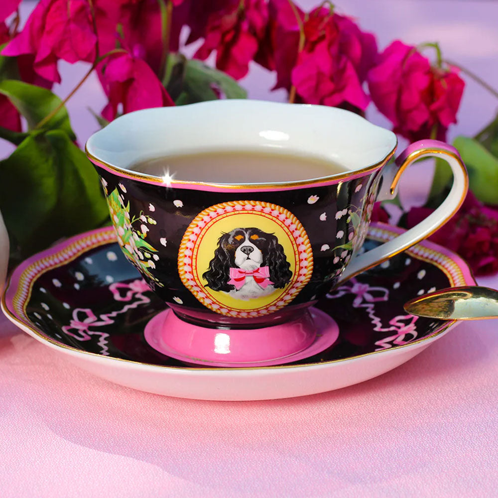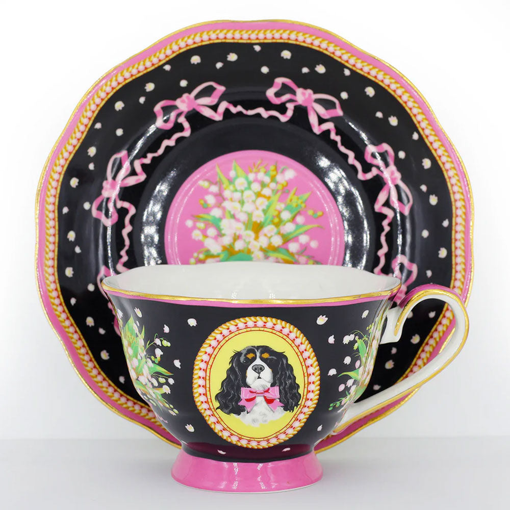 סט מלכותי של צלחת וכוס פורצלן עם איור מקסים של קינג צ'ארלס פרוותי. העיצוב משלב רקע בגוון שחור, פרחים לבנים וסרטים ורודים - הכל מצויר ביד בצבעים עזים ומעוטר בזהב אמיתי 24K.