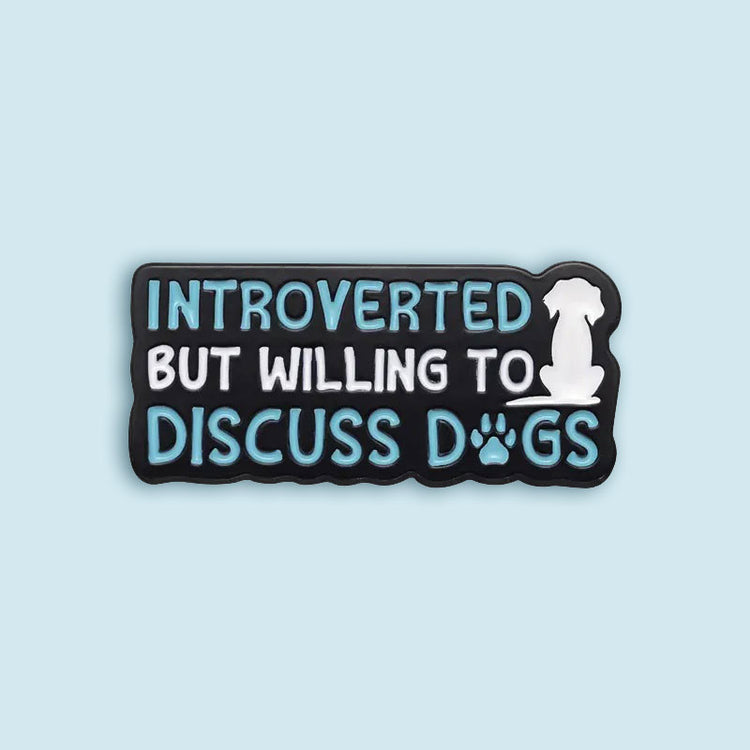 סיכת אמייל עם הכיתוב “Introverted but willing to discuss dogs”. איכותית ומצחיקה לאנשים מיוחדים שמעדיפים לדבר על כלבים מאשר על כל דבר אחר.