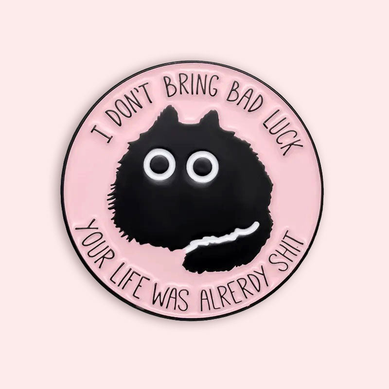 הוסיפו קריצה שובבה ללוק שלכם עם הסיכה המצחיקה הזו. חתול שחור לצד משפט שהוא תשובה לכל אלה שחושבים שחתולים שחורים מביאים מזל רע: I don't bring bad luck your life was already shit.