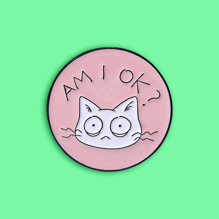 סיכה עגולה מתוקה עם פרצוף מצחיק של חתול על רקע ורדרד מלווה בשאלה הכל כך לגיטימית "Am I OK?"