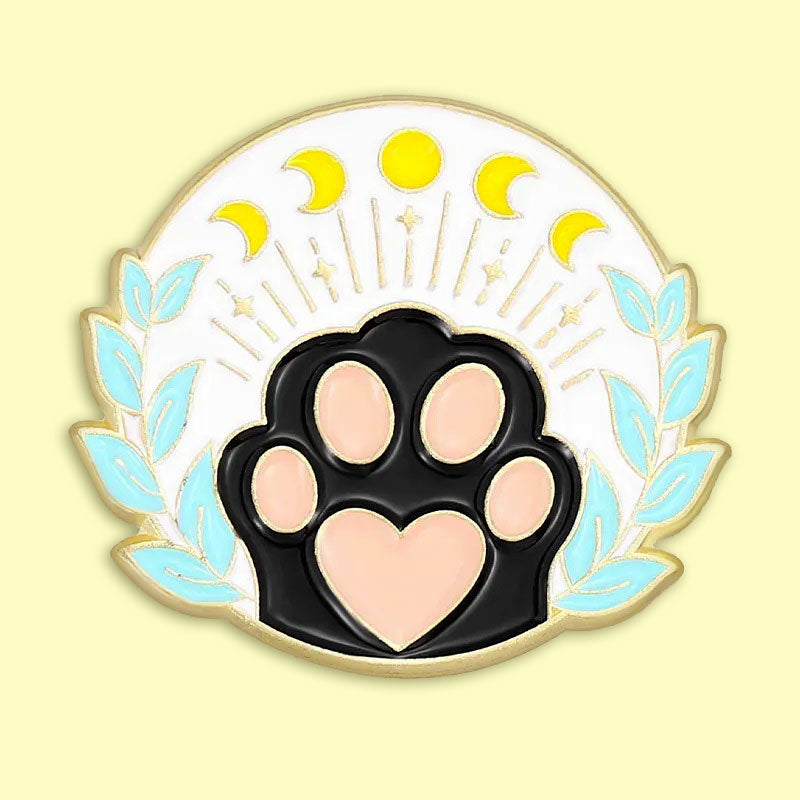 סיכת אמייל שהיא כפה מתוקה עם כרית בצורת לב, מוקפת בעלים עדינים וירחים קסומים. אות הערכה לאותו חלק בגוף שכל אוהבי החיות כל כך אוהבים. מתנה מתוקה לאוהבי הכפה.