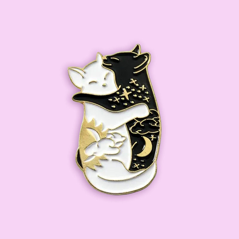 סיכת אמייל המשלבת שני חתולים מתוקים אחד שחור והשני לבן, מכורבלים אחד עם השני. האחד מעוטר בסמלי לילה והשני בסמלי יום.