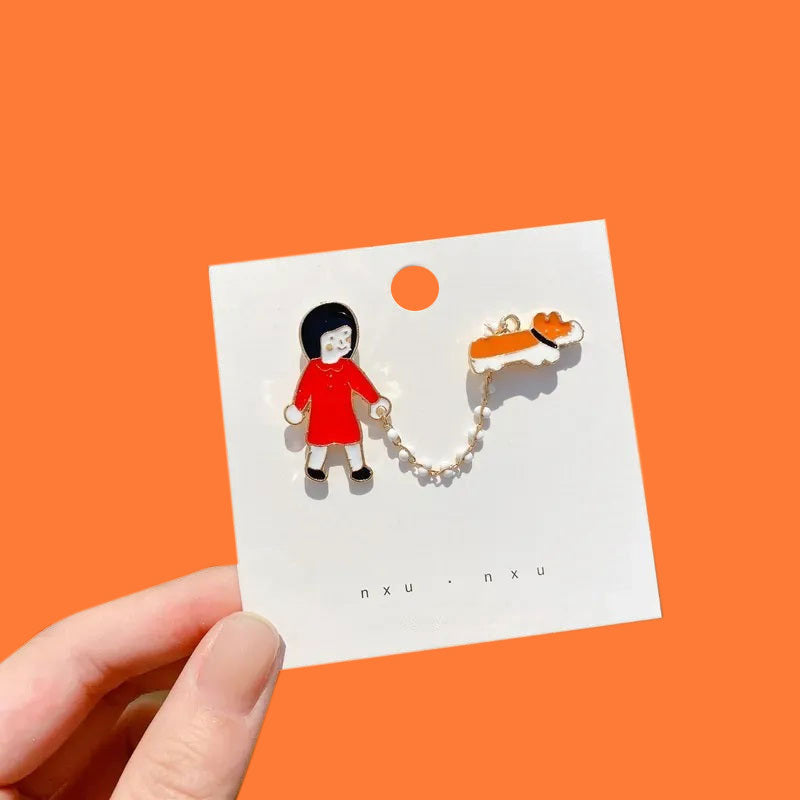 סיכת אמייל מיוחדת של ילדה קטנה בשמלה אדומה, בידה שרשרת עדינה מוזהבת עם חרוזים קטנים ובסופה כלב קטן וחמוד.
