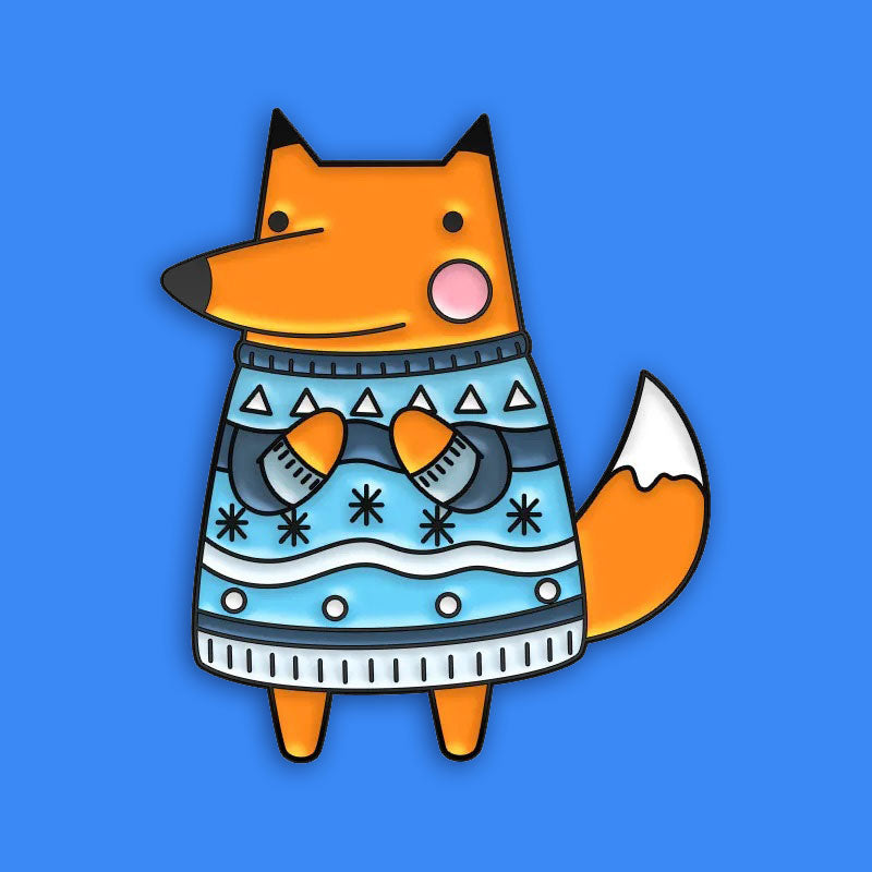 סיכת אמייל איכותית ומתוקה של כלב מתוק לובש סוודר כחול וחורפי.