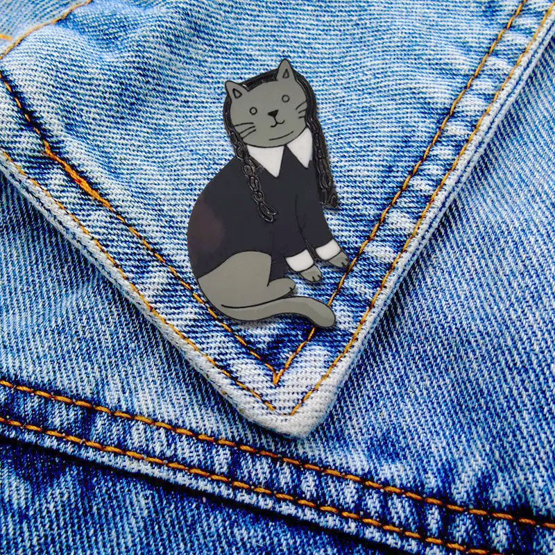 למשפחה הכי מפורסמת, אפלה ומצחיקה מצטרפת חתולה... סיכת אמייל איכותית בדמות חתולה המחופשת בדיוק רב לדמותה האייקונית של וונסדיי אדמס.