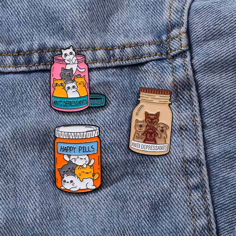 סיכת אמייל עם צנצנת חתולים שתחליף את נוגדי הדיכאון! זו לא סתם סיכה, זו הצהרה - מי צריך פסיכיאטר כשיש לך חתול?