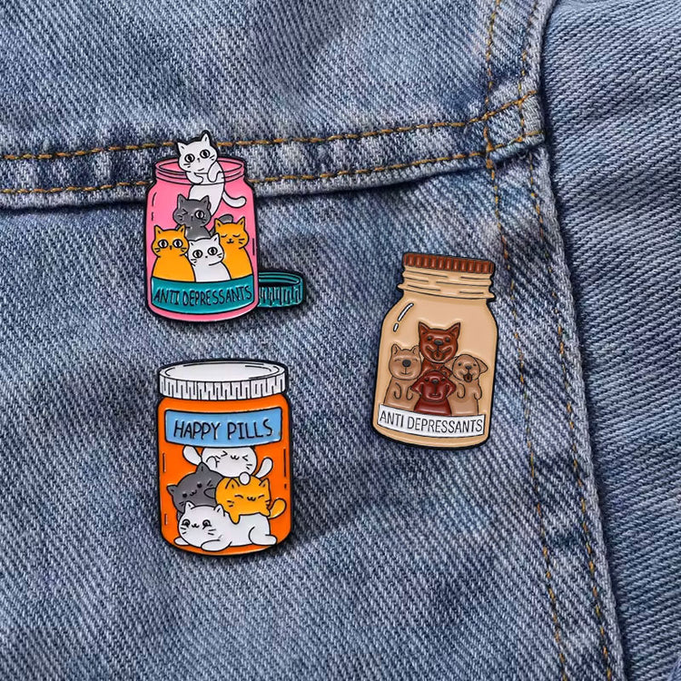 כל אוהב חתולים יסכים שנוגד הדיכאון הטוב בעולם הוא צליל הגרגור של חתול מאושר. סיכת אמייל עם צנצנת חתולים "נוגדי הדיכאון" היא בדיוק מה שכל אוהב חתולים צריך.