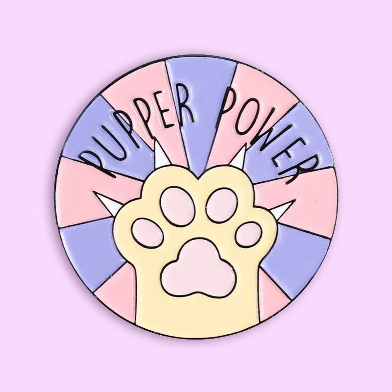 סיכה עגולה וצבעונית שמציגה כף רגל חמודה של כלב, מלווה בכיתוב המעצים "Pupper Power". עשויה מאמייל איכותי, הסיכה מוסיפה נגיעה של שמחה וחיוניות לכל בגד או תיק.