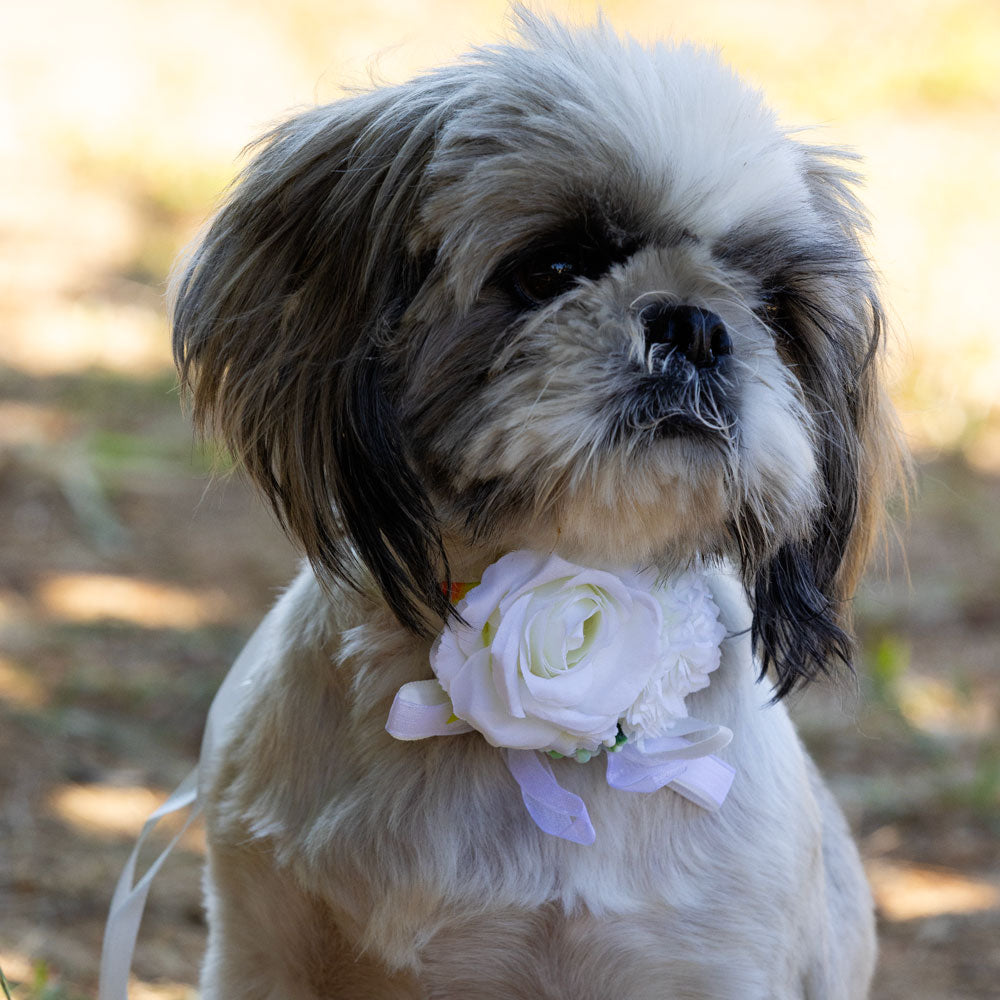 החבר הפלאפי שלכם מצטרף לארוע המיוחד? הפכו אותו לאורח הכבוד עם סרט קשירה לצוואר או לראש! סרט סאטן משולב עם שני פרחים לבנים גדולים מוקפים בניצני פרחים לבנים.