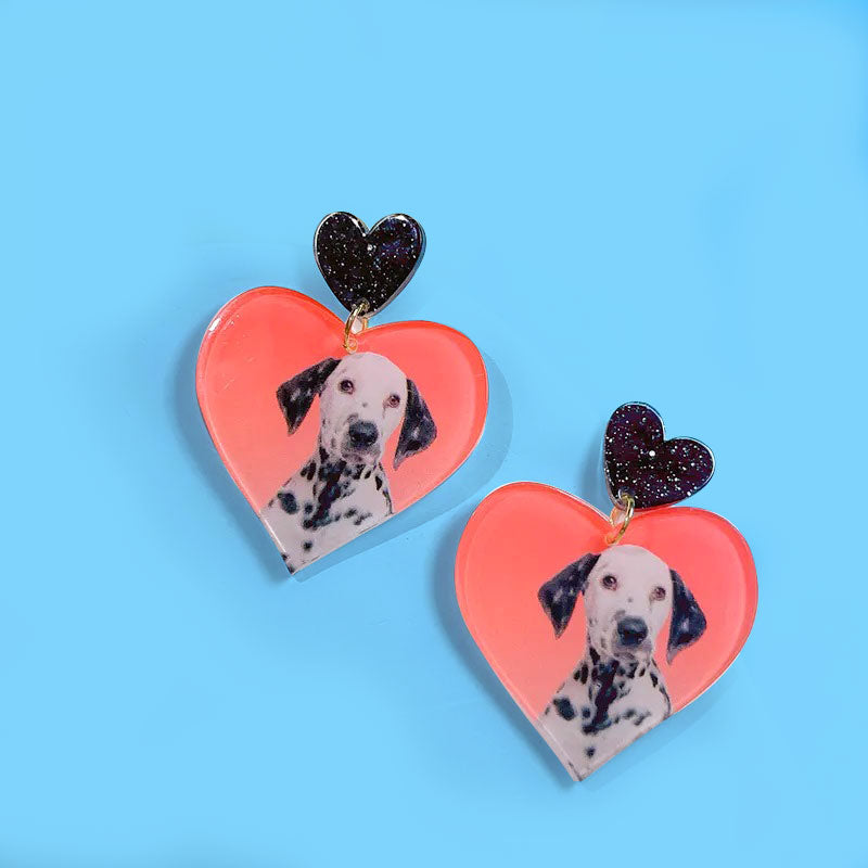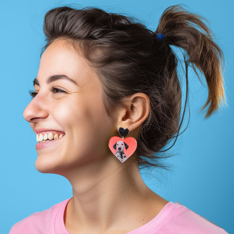 עגילי אקריל בצורת לב, משולבים עם הדפסה של כלב דלמטי על רקע ורדרד.