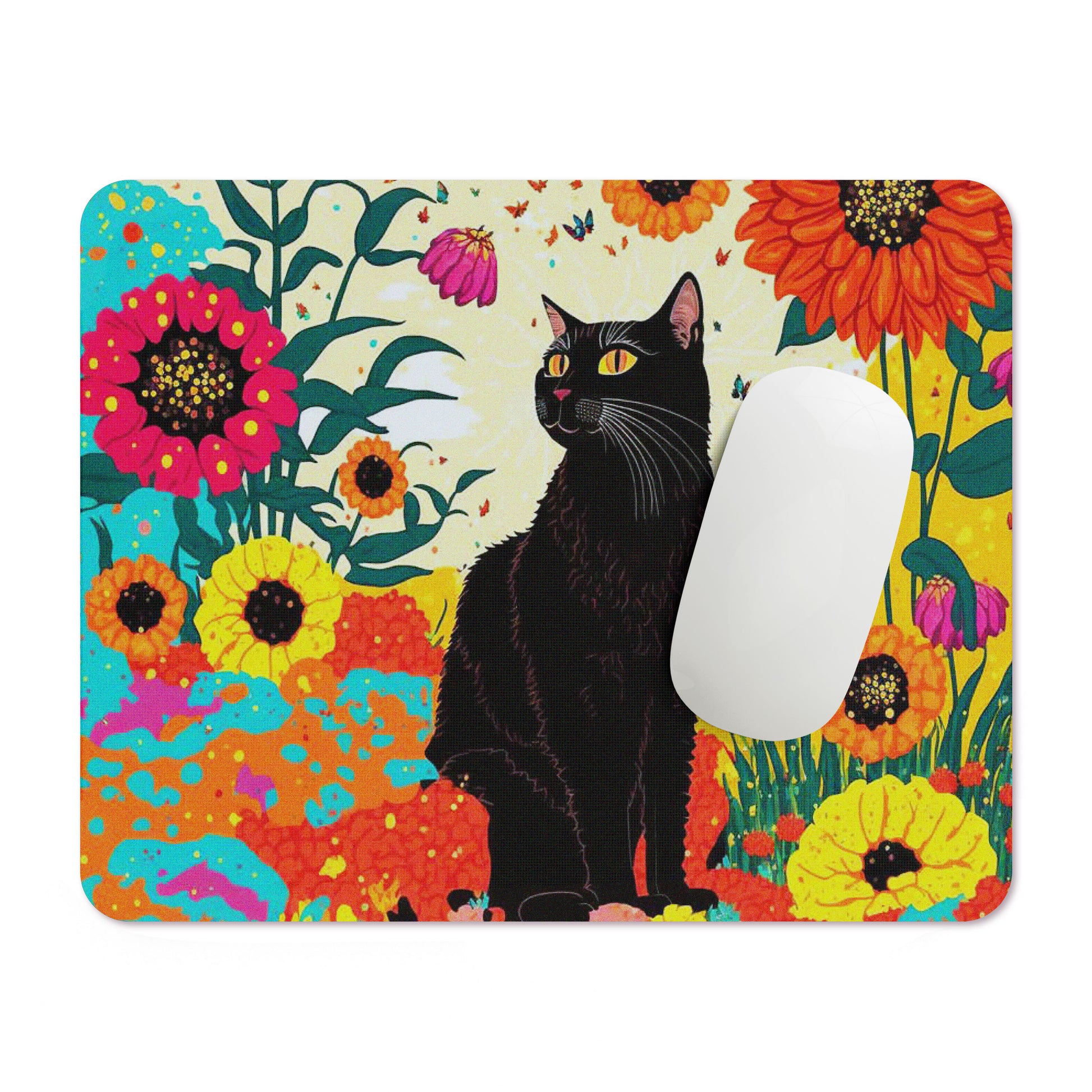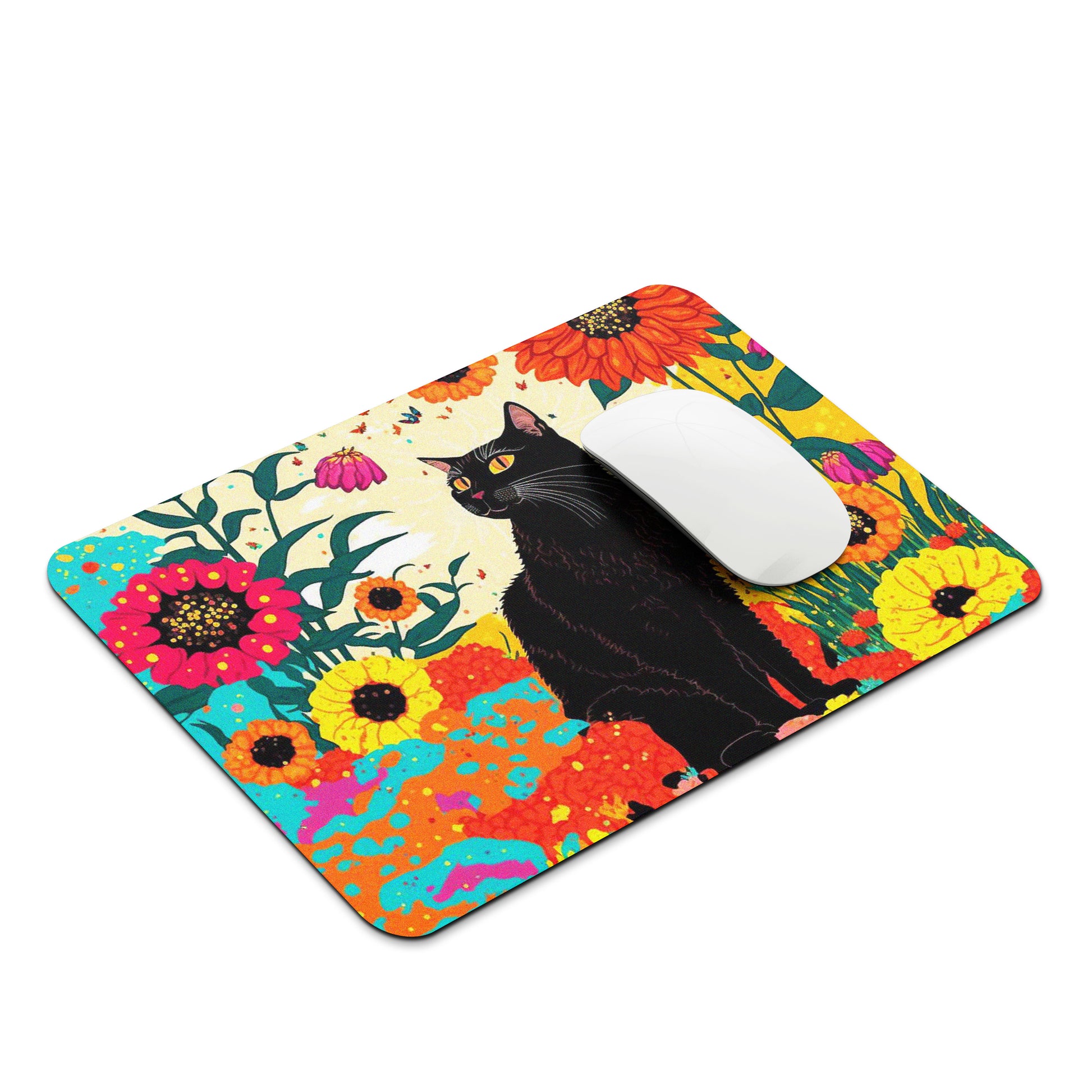פד מיוחד מקולקציית העיצובים של בסטיז עליו מופיע חתול שחור אלגנטי, מוקף בשפע של פרחים צבעוניים ומרהיבים.