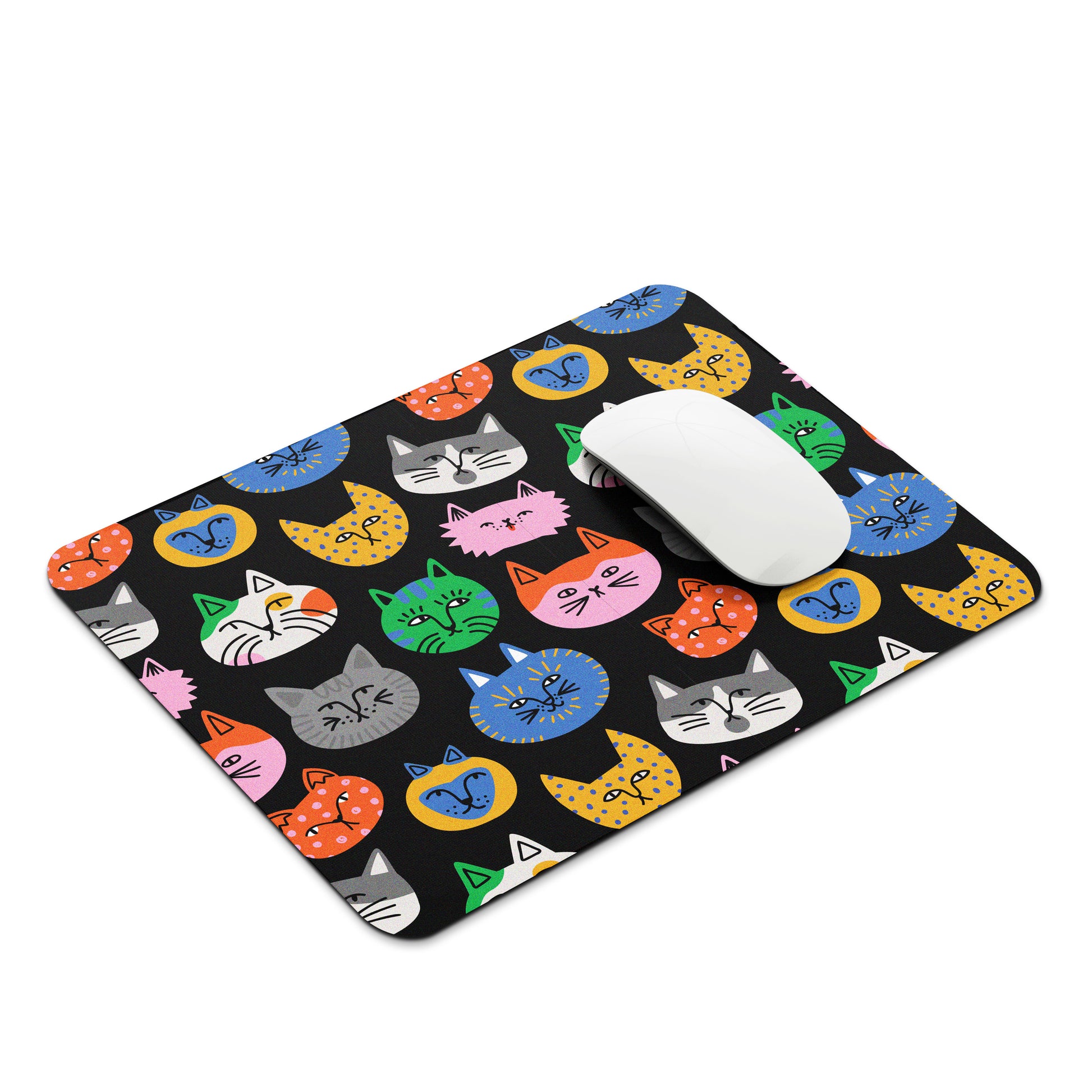 הכירו את הפד למחשב מקולקציית הפדים הייחודית שלנו בבסטיז, המציג פטרן צבעוני ומשעשע של איורי חתולים משעשעים על רקע שחור.